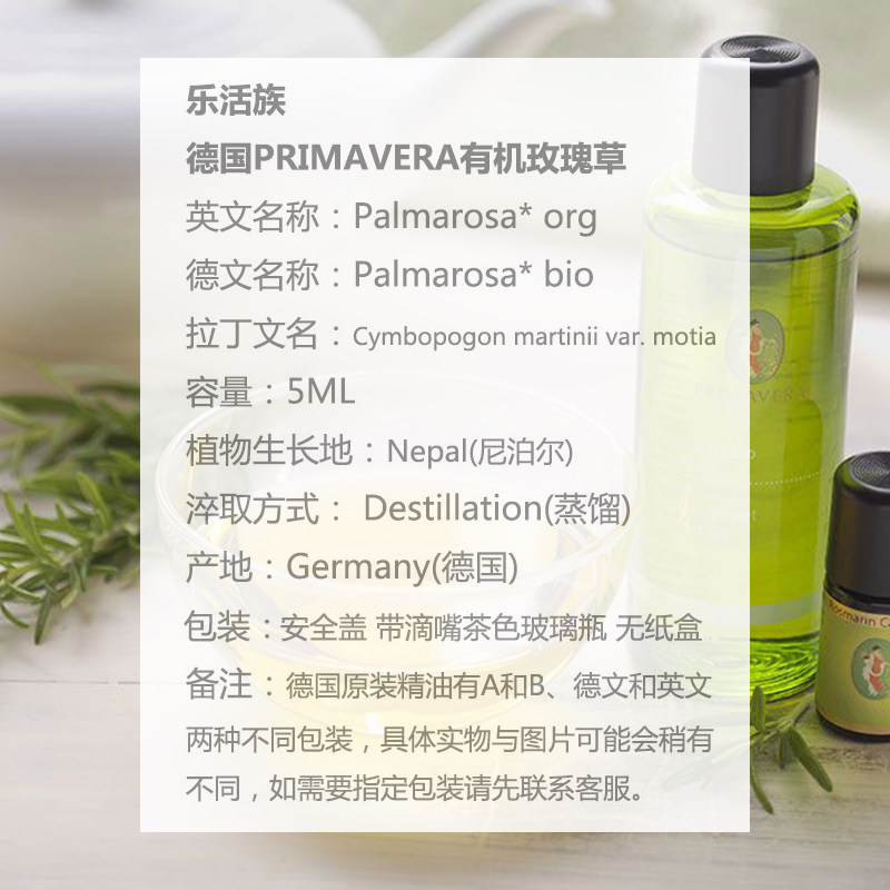 有机玫瑰草单方精油5ml乐活族德国P家正品官方原装进口Palmarosa