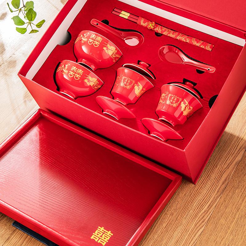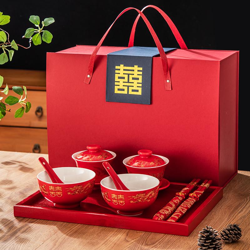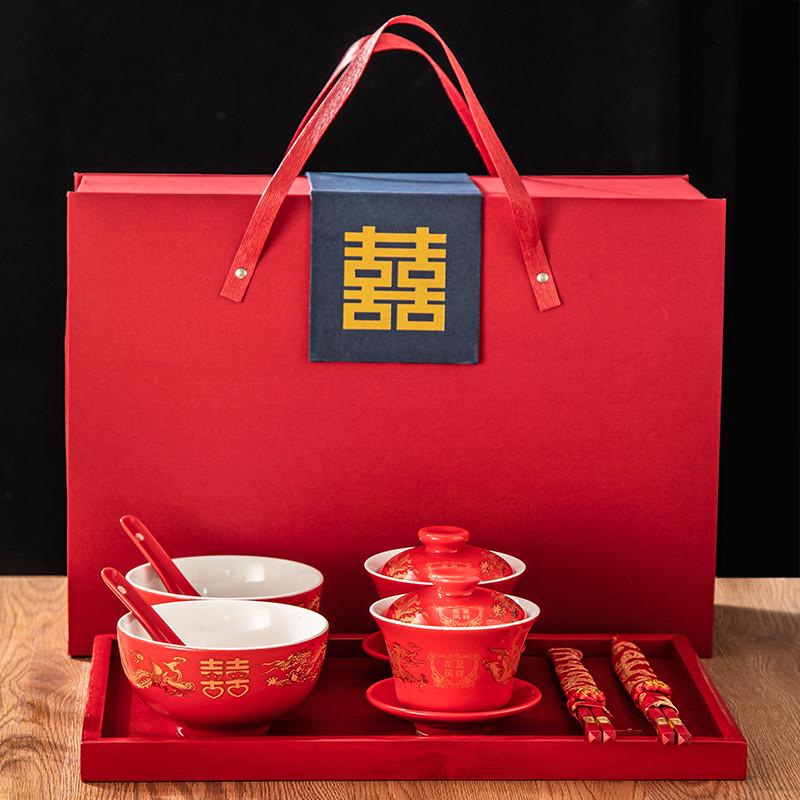 婚庆用品大全陶瓷龙凤喜碗敬茶杯陪嫁新结婚改口杯碗筷勺礼品盒装