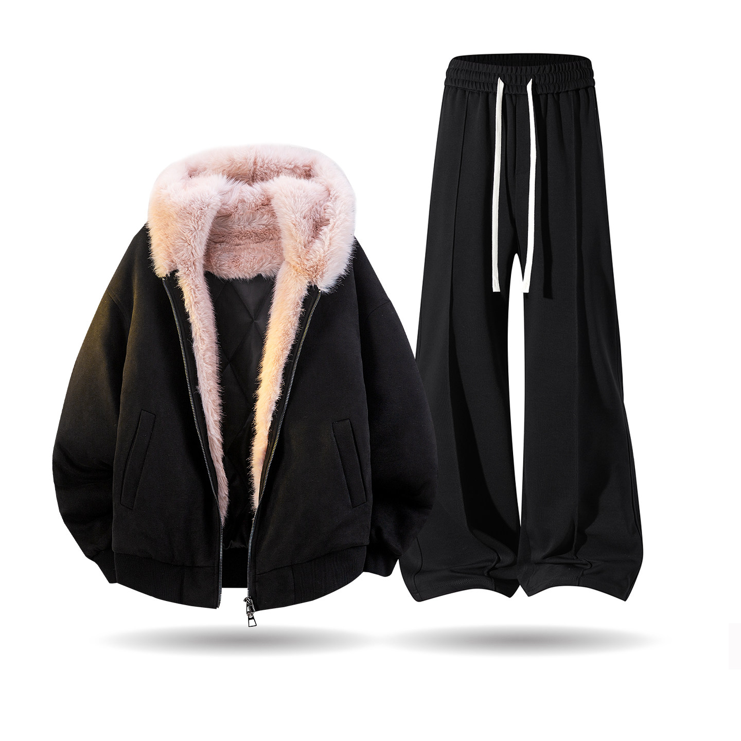 拉夏贝尔黑色休闲运动套装男士秋冬座山雕棉服搭加绒卫裤一整套潮