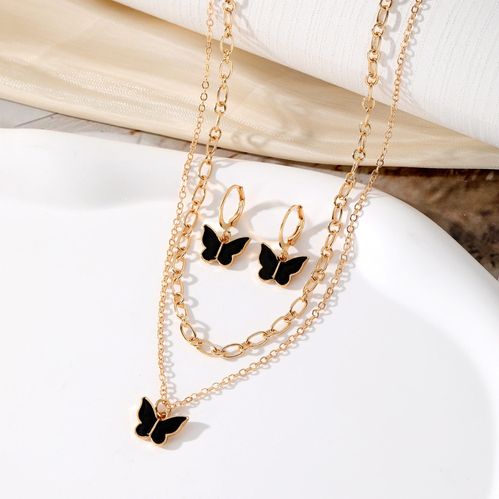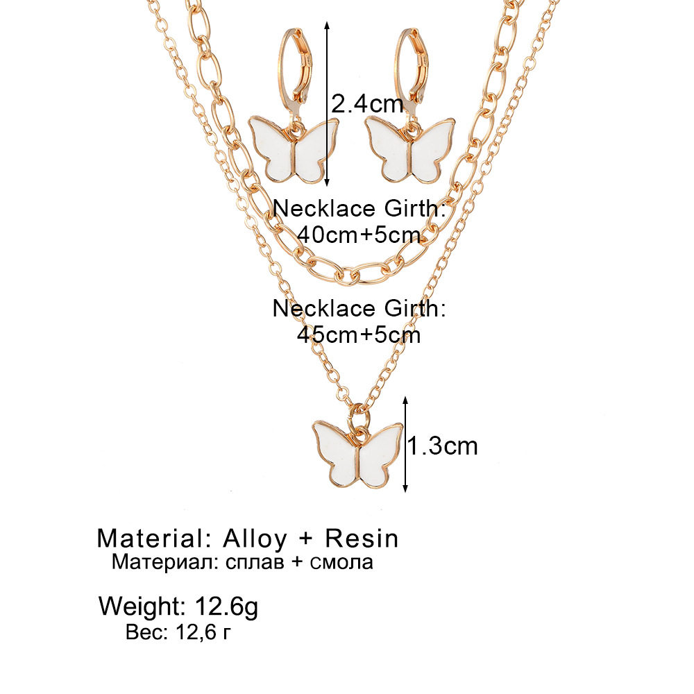 欧美新品首饰套装 时尚通勤滴胶蝴蝶叠戴风项链小巧精致蝴蝶耳扣