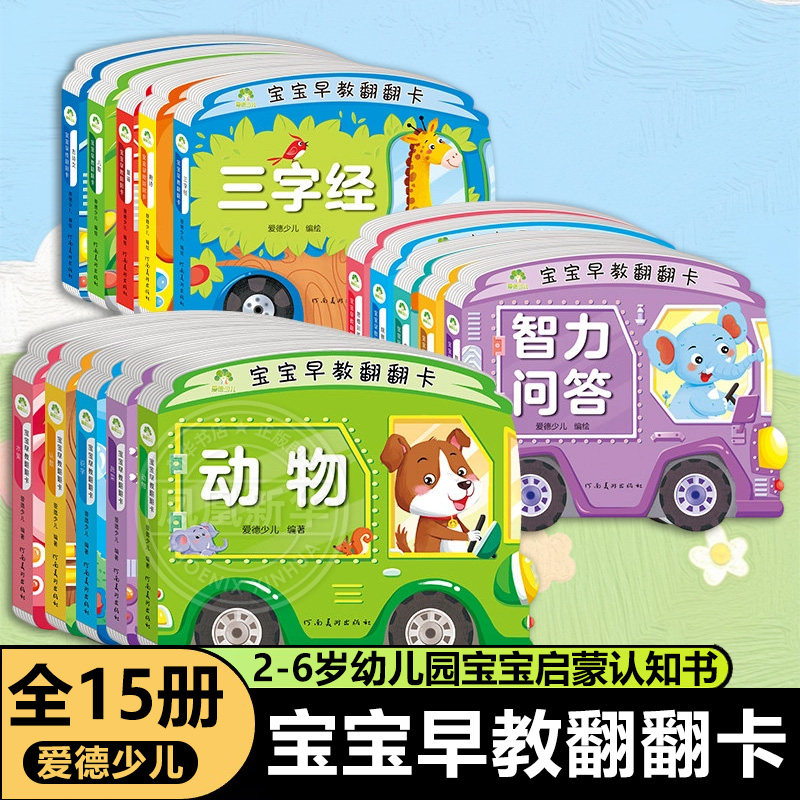 爱德少儿 宝宝早教翻翻卡全15册 动物蔬菜水果认数识字古诗文三字经儿歌专注力思维训练 2-6岁幼儿园宝宝启蒙认知书黑白卡识字卡
