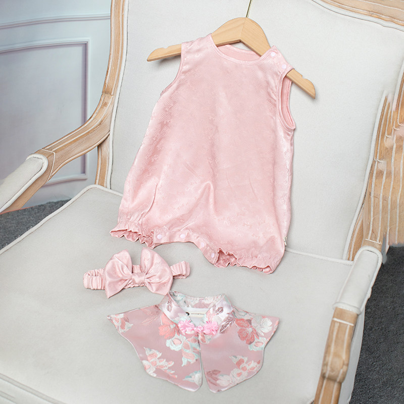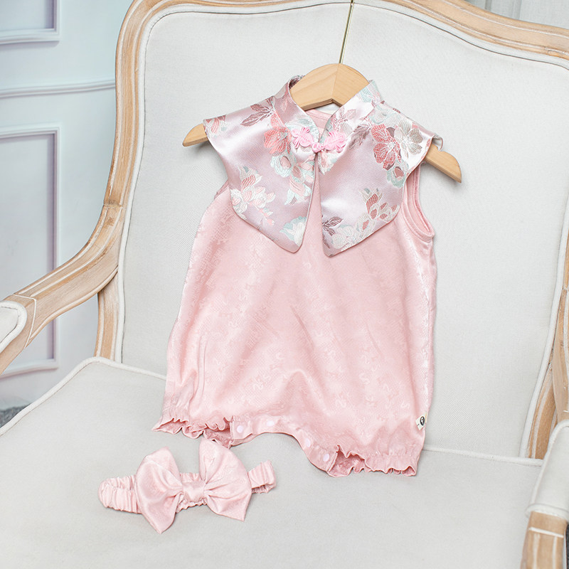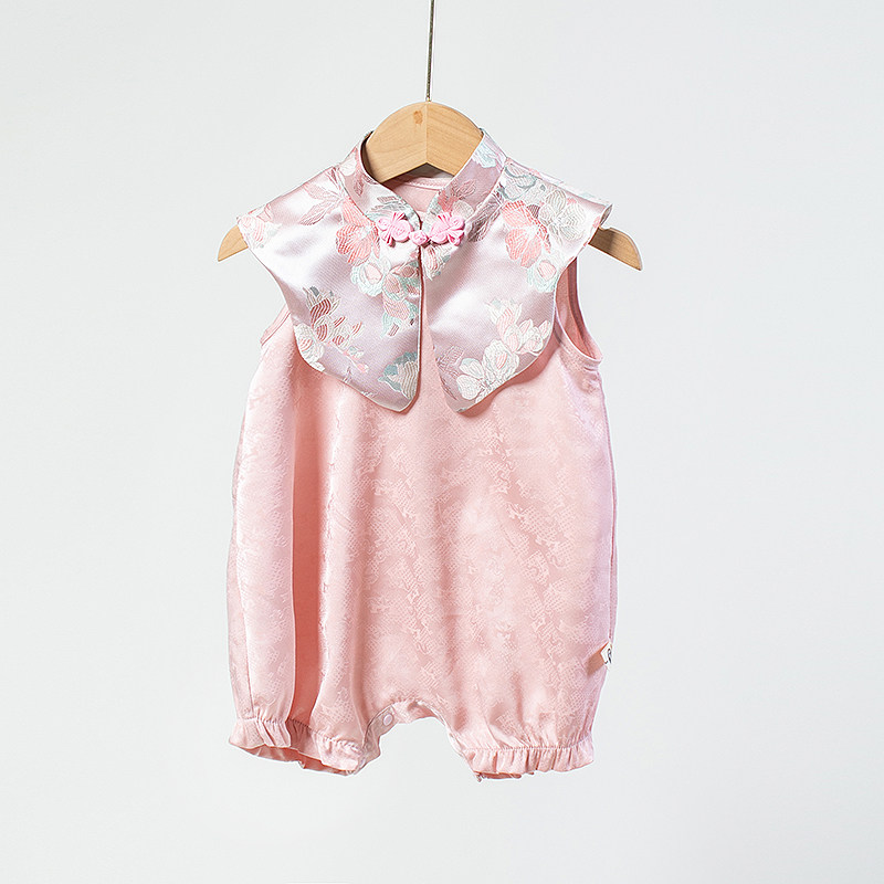 女宝宝周岁礼服夏季薄款婴儿满月百日宴新中式连体衣抓周粉色国风