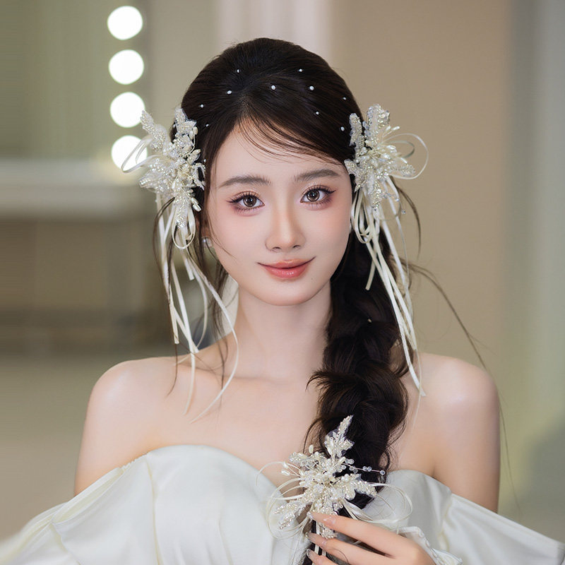 2025新款新娘韩系飘带发饰串珠精致发夹温柔唯美氛围感配饰品套装