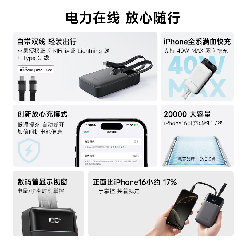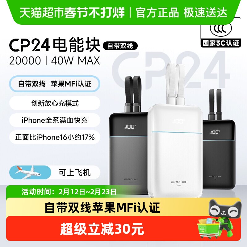 【3C认证】CUKTECH酷态科CP24充电宝自带双线20000毫安时移动电源