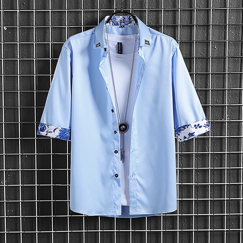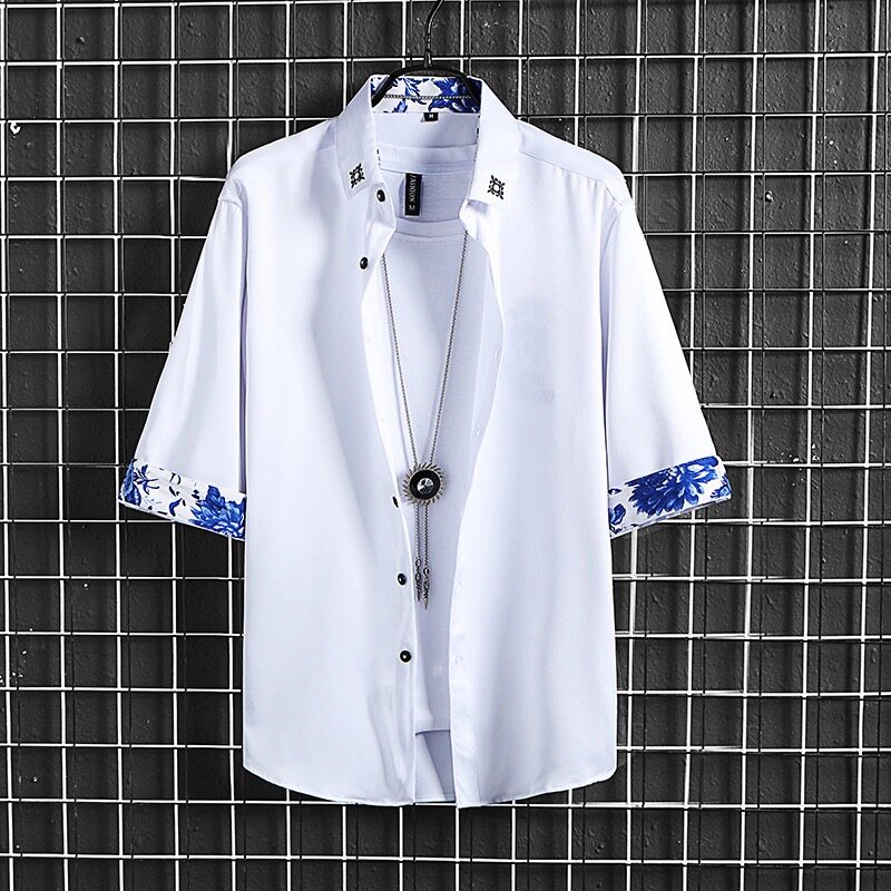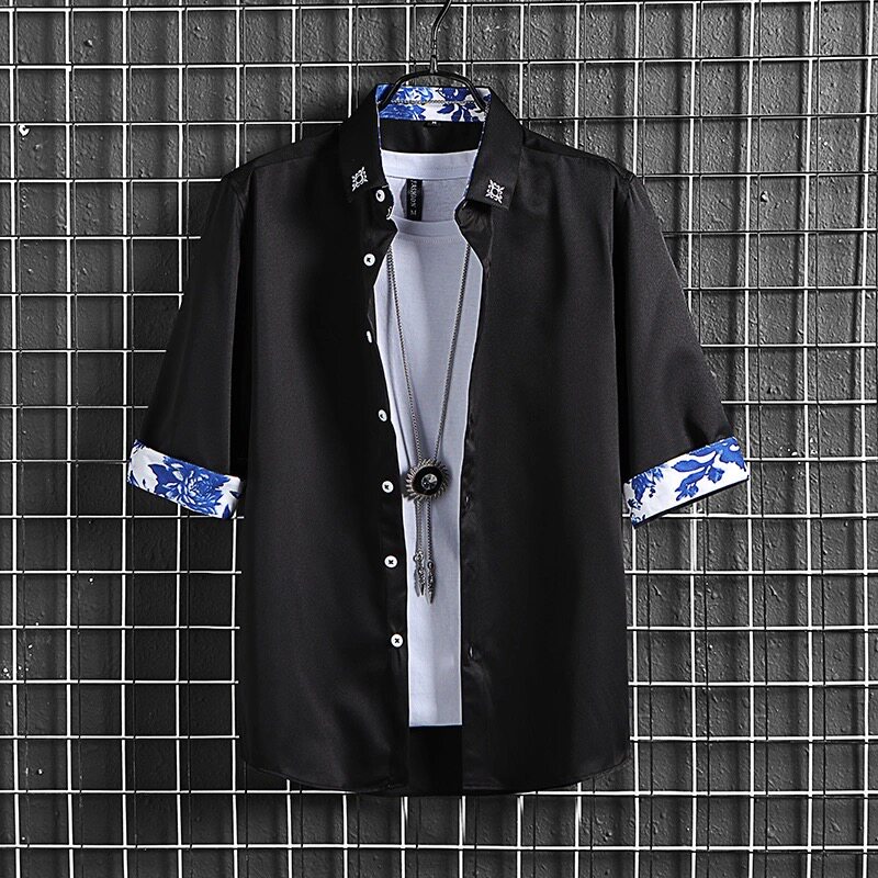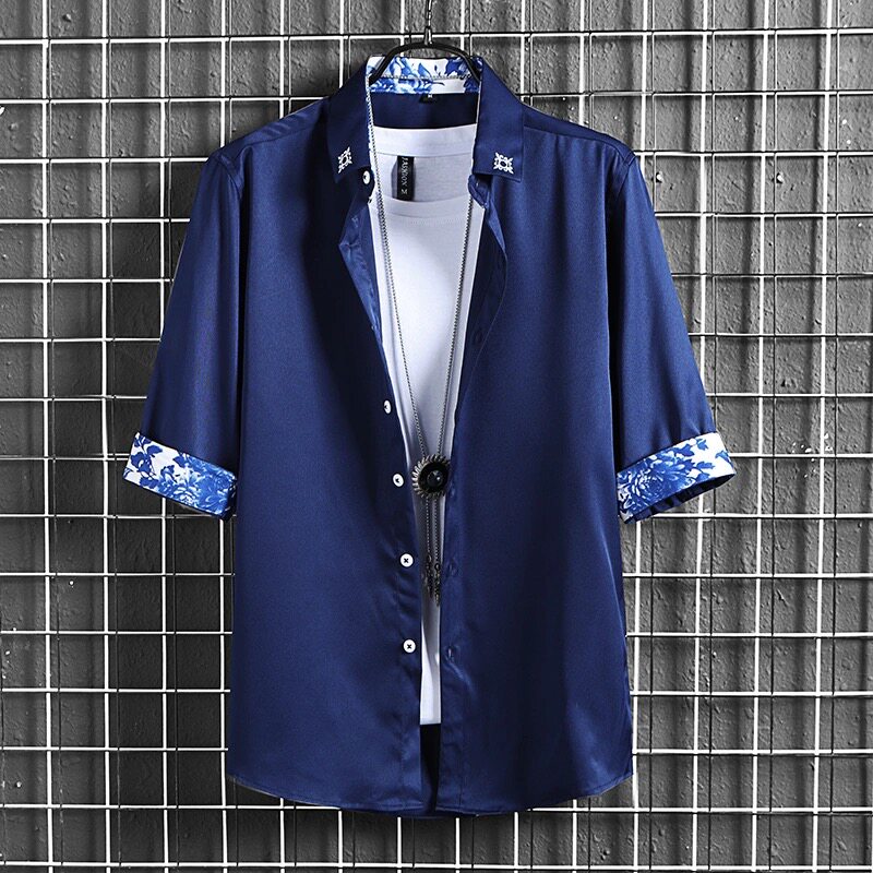 男士潮牌七分袖衬衫韩版帅气夏天发型师纯色休闲潮流刺绣中袖衬衣