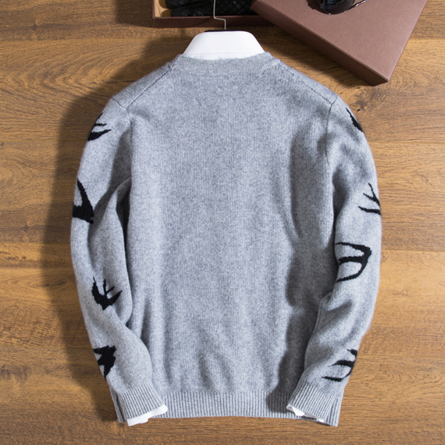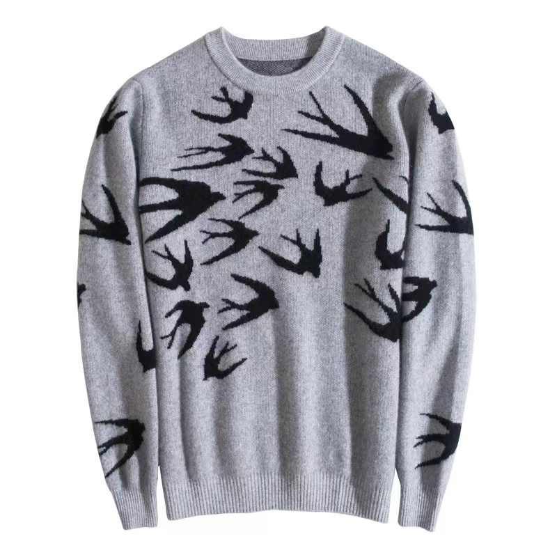 2025新款燕子提花圆领羊绒衫男青年加厚山羊绒针织毛衣保暖套头衫