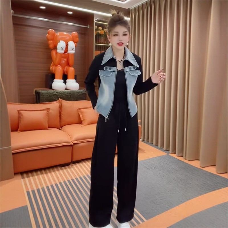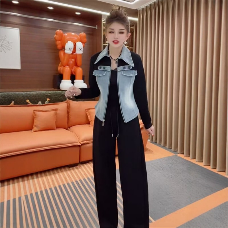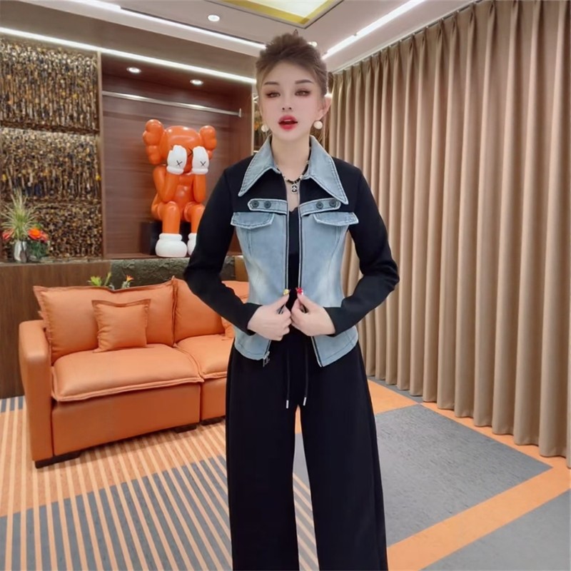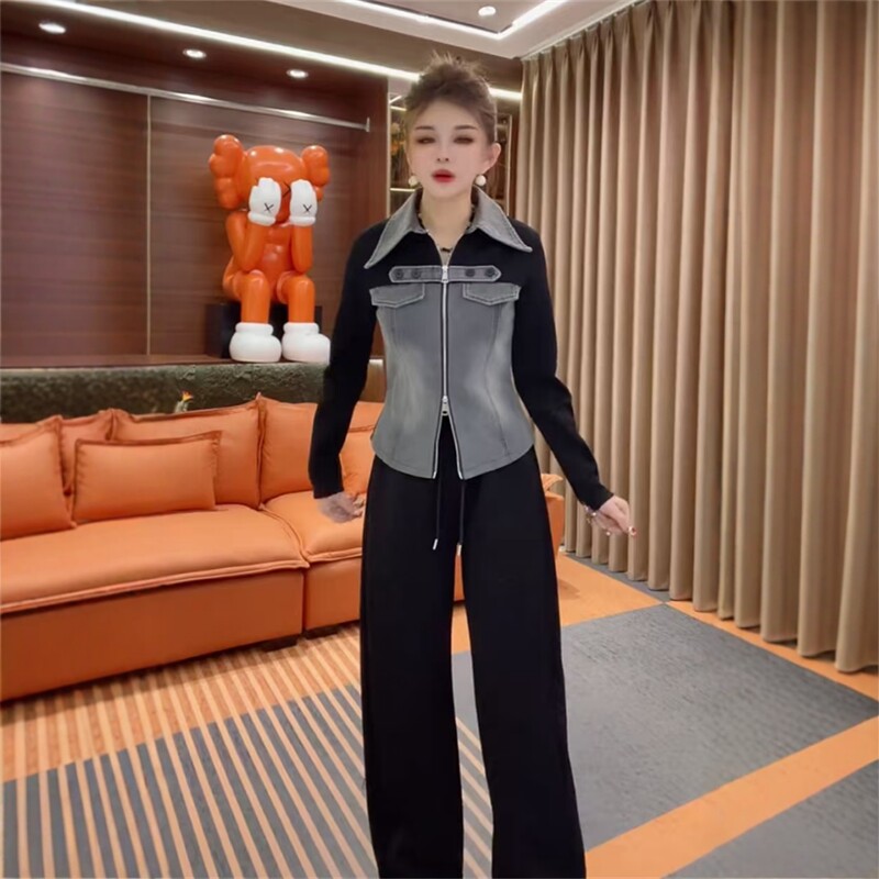 春季新款女士休闲套装双拉链牛仔布上衣松紧腰弯刀裤洋气两件套女