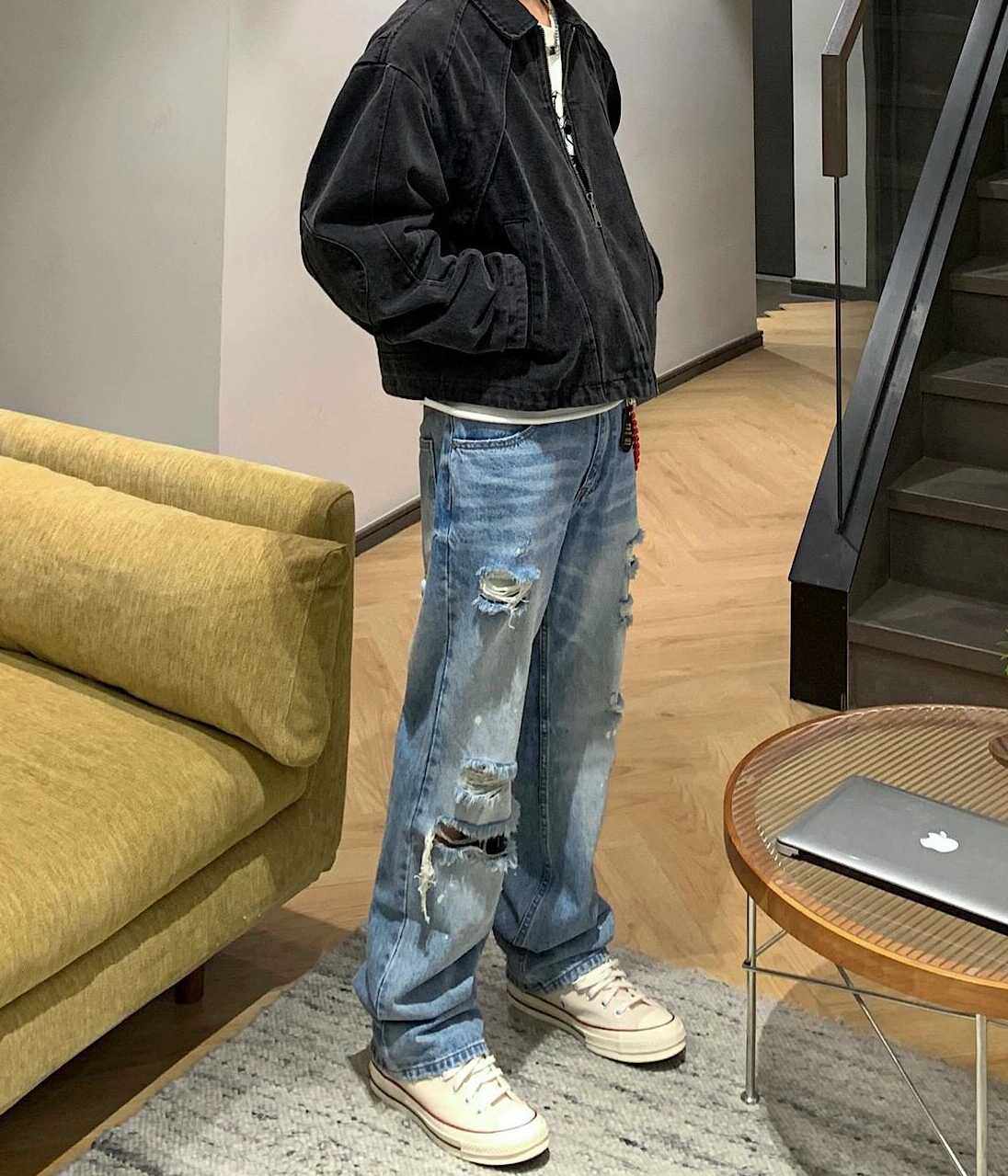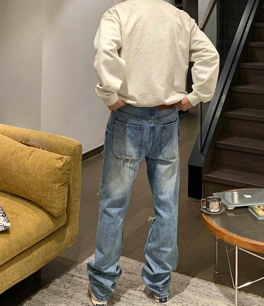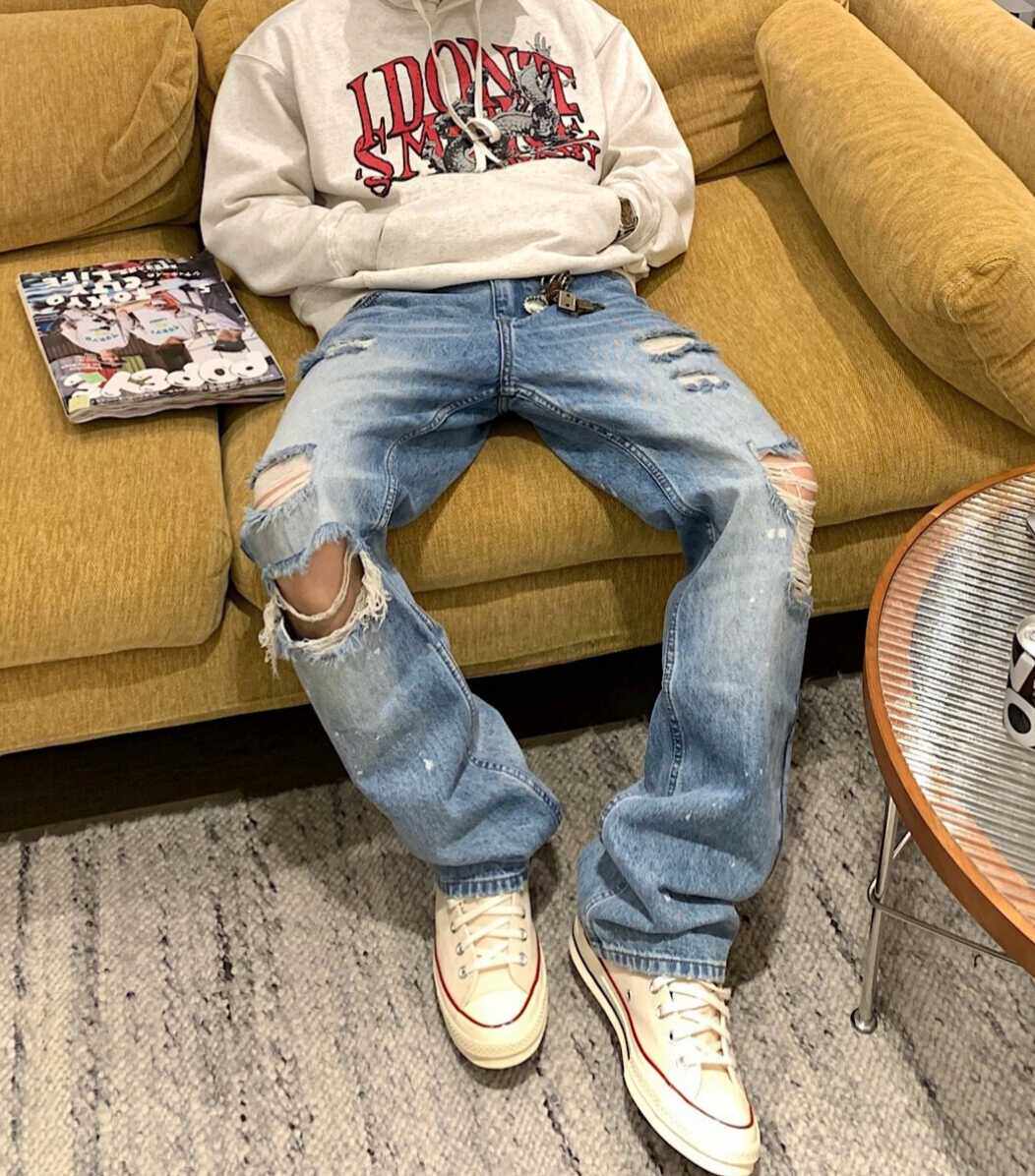 美式高街破洞牛仔裤夏季质感设计款浅色直筒堆堆裤宽松显瘦vibe风