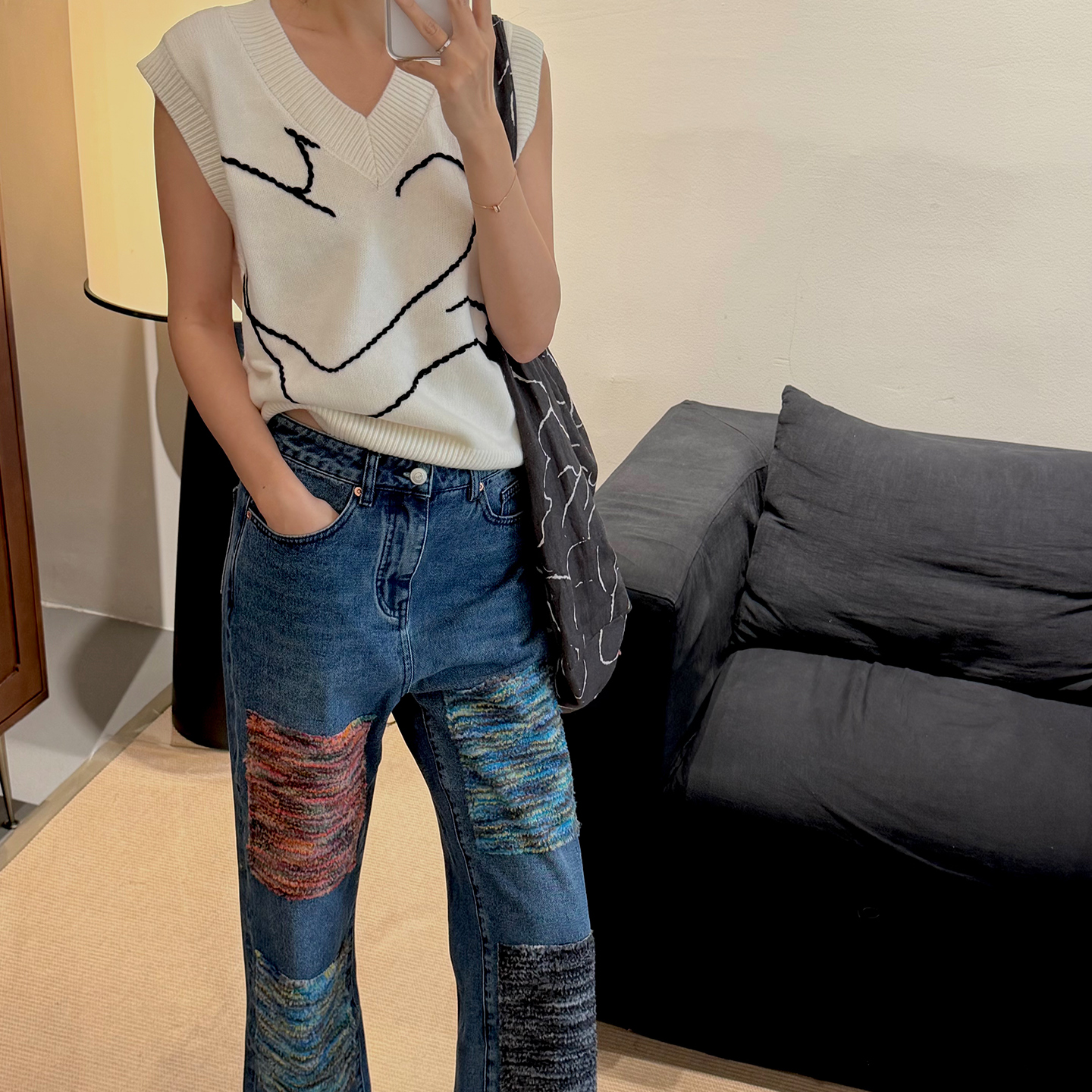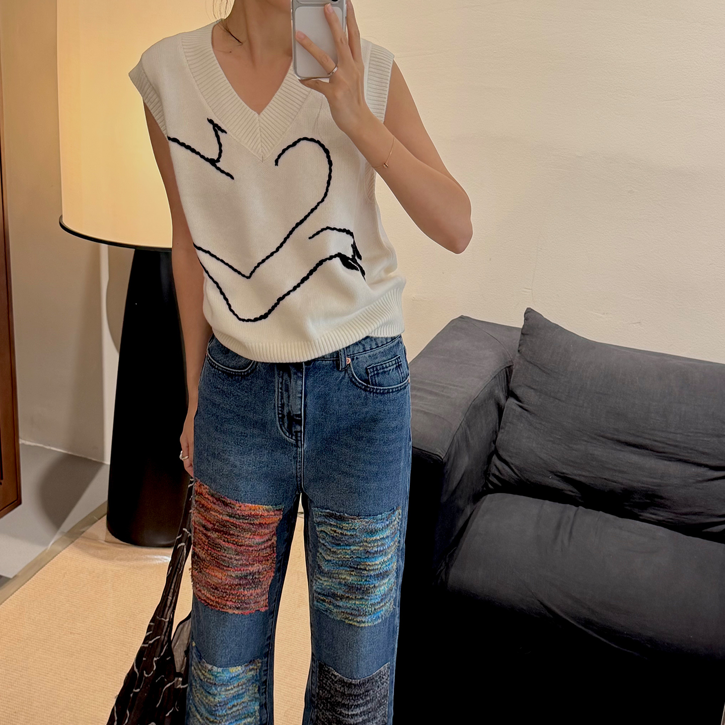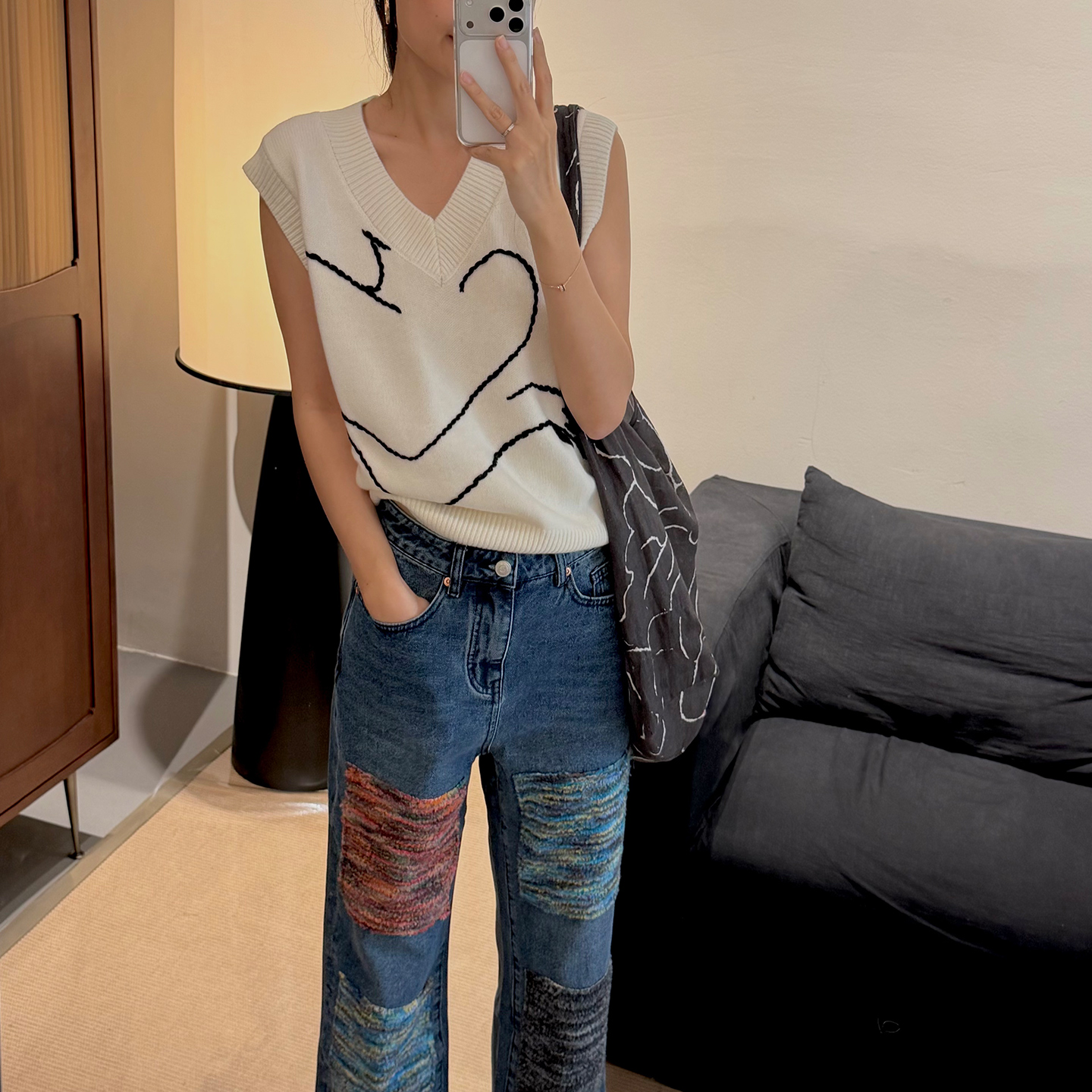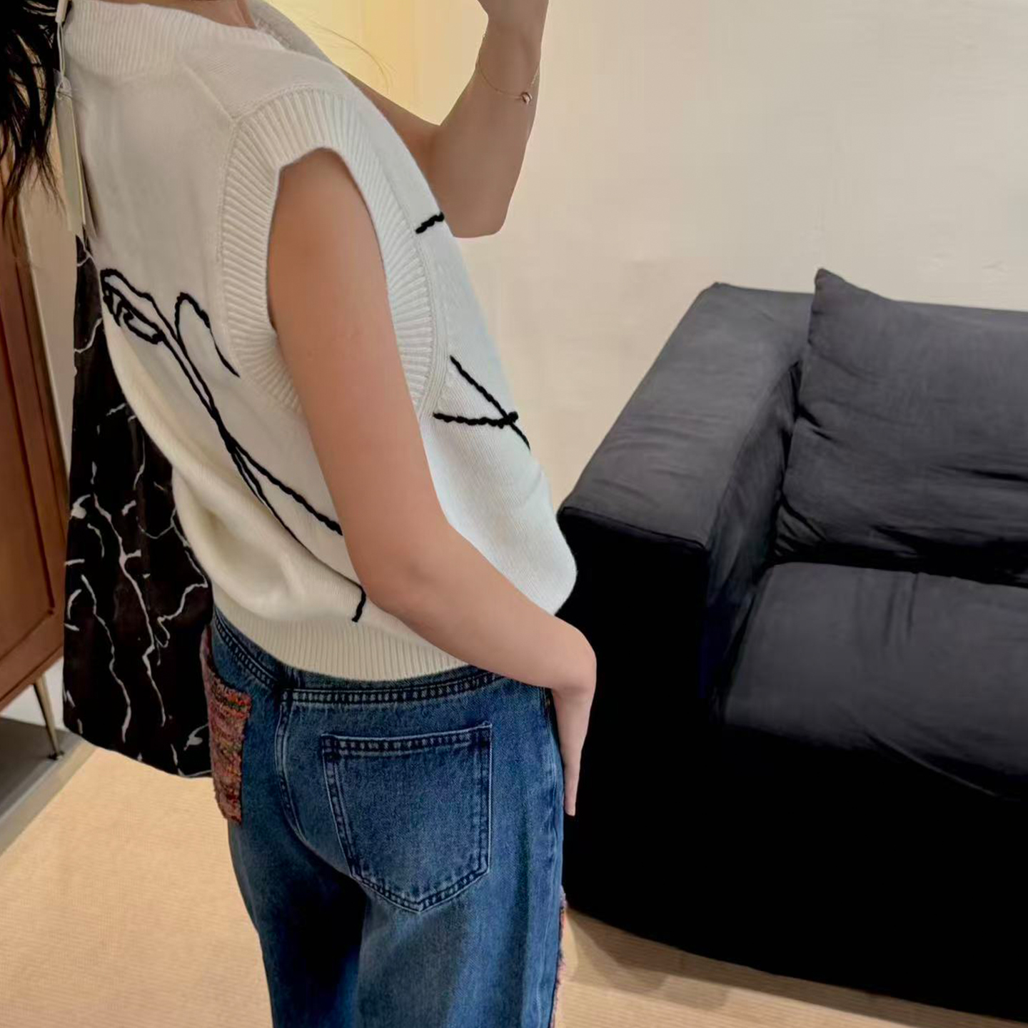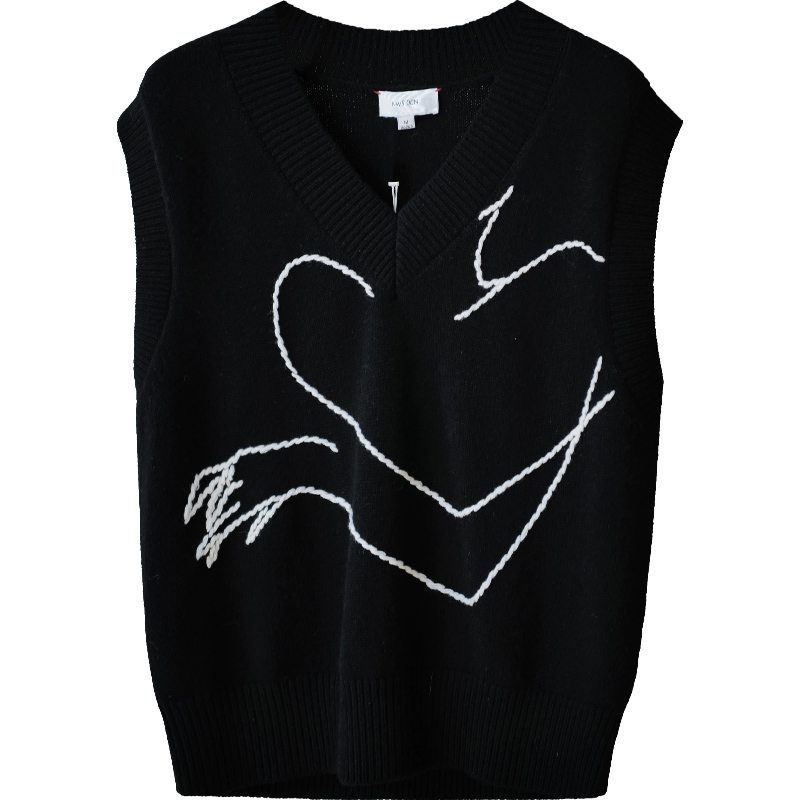 NW8 0EN《With u》手工绣花v领毛衣马甲绵羊毛黑色超好看的上衣女