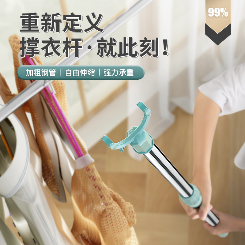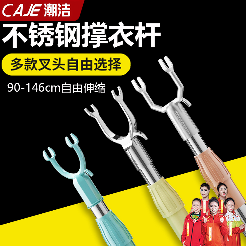 潮洁加粗不锈钢可伸缩晾衣杆铝合金撑衣杆家用宿舍阳台通用衣叉头