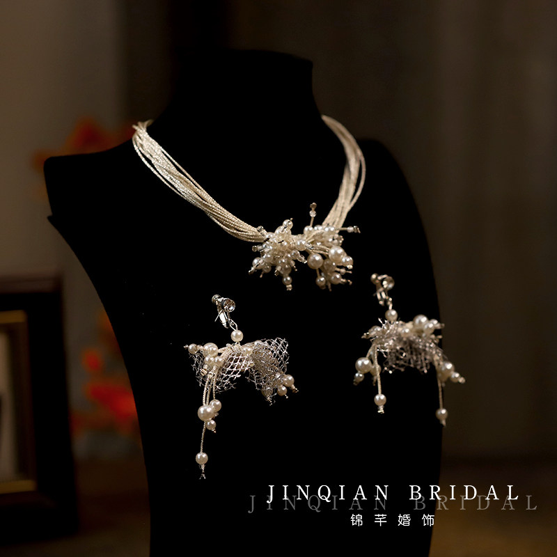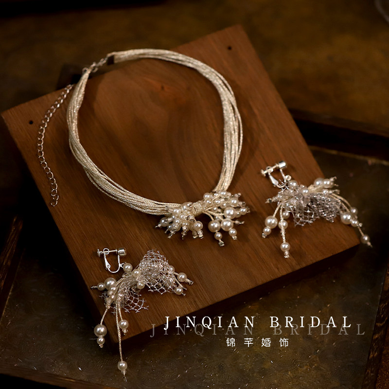 高级感气质银色多层珍珠项链脖链耳环银网珍珠个性礼服婚纱配饰品