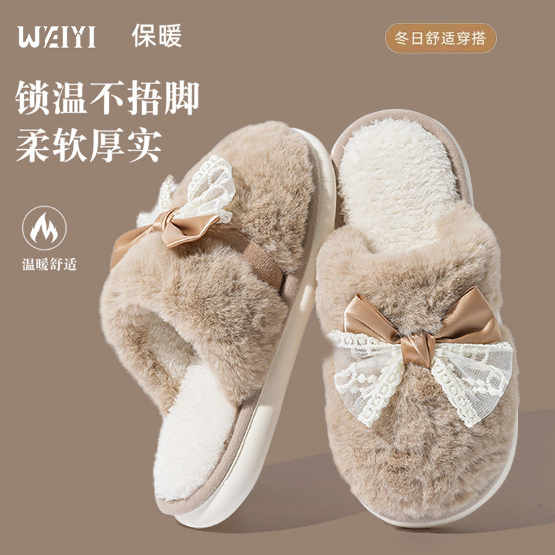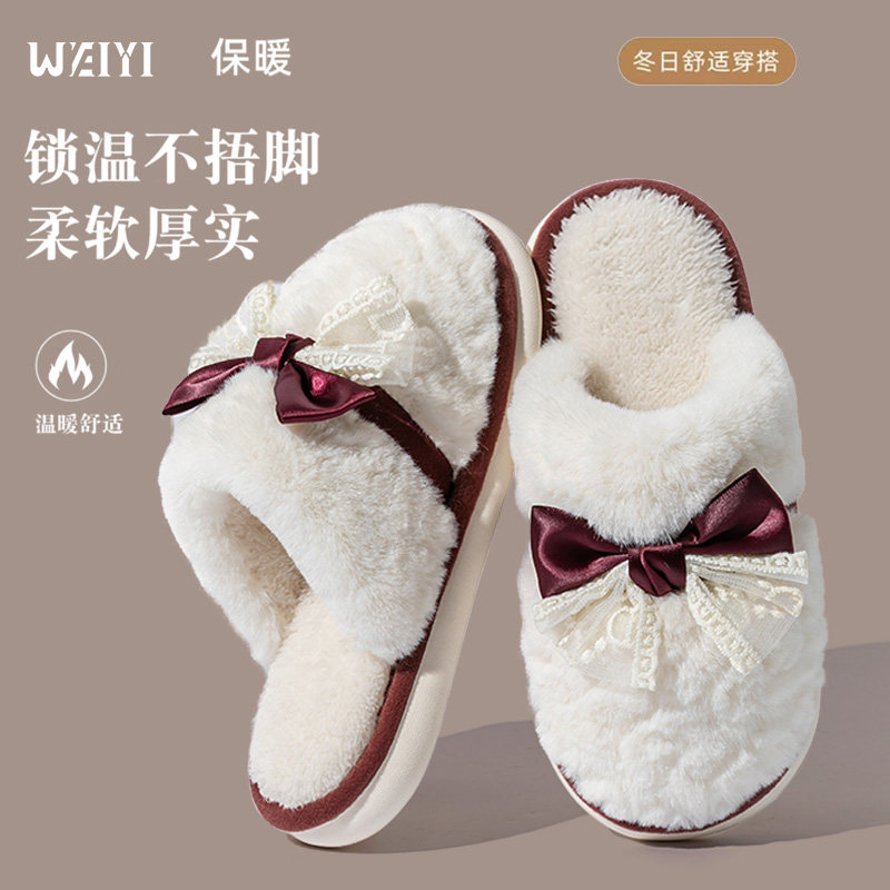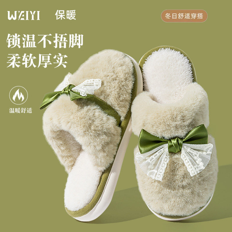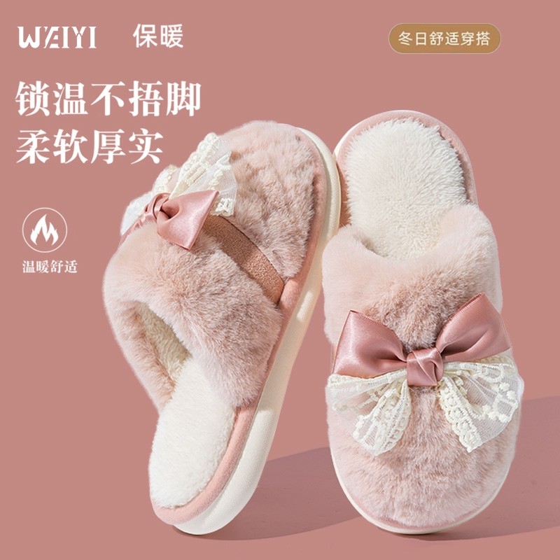蝴蝶结女士保暖防滑厚底居家日用时尚百搭加绒棉拖鞋多规格