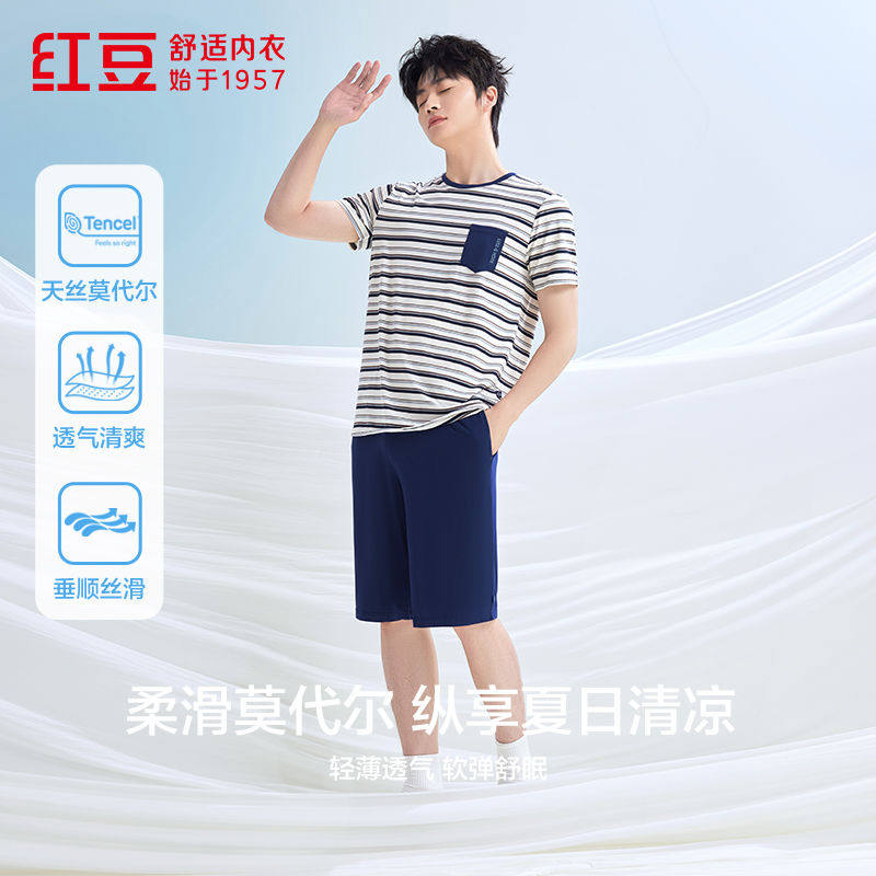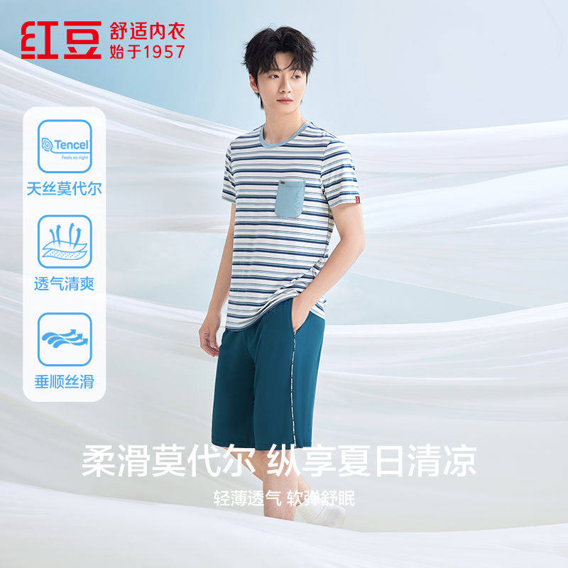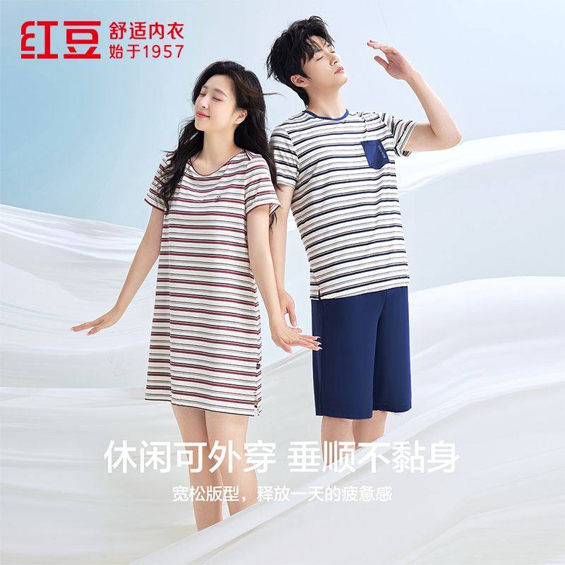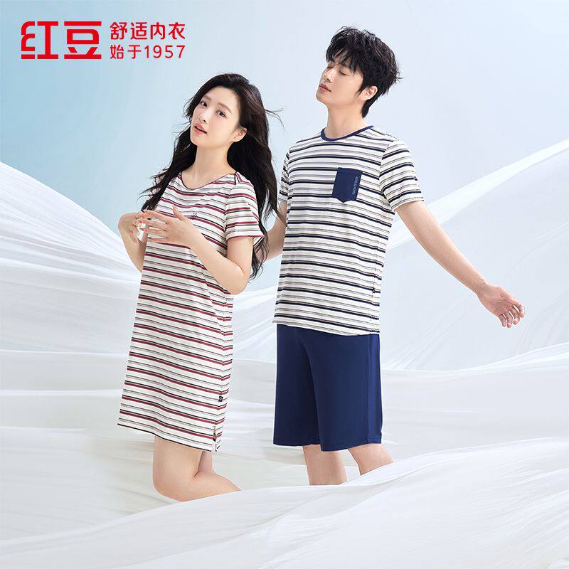 红豆专柜同款莫代尔条纹男士睡衣短袖圆领家居服女士可外穿睡裙