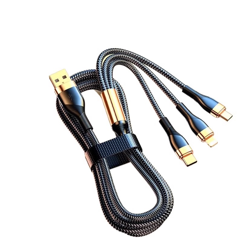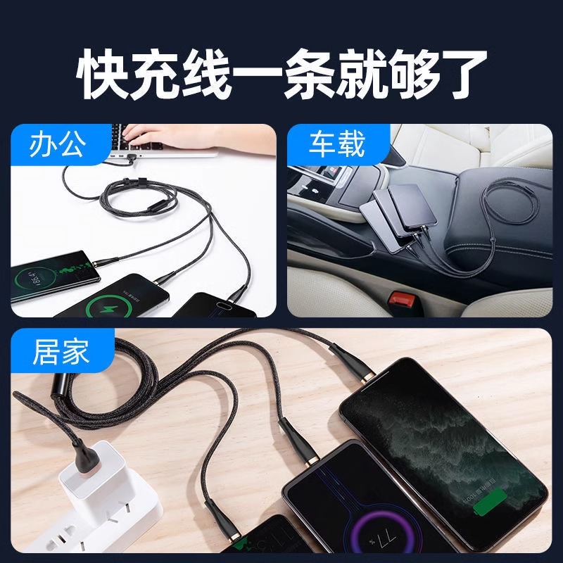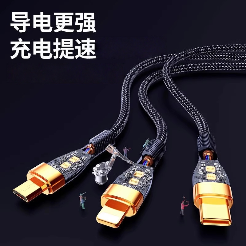 三合一数据线超级快充一拖三多功能车载适用手机充电线适用苹果华为OPPO透明芯片typec安卓USB