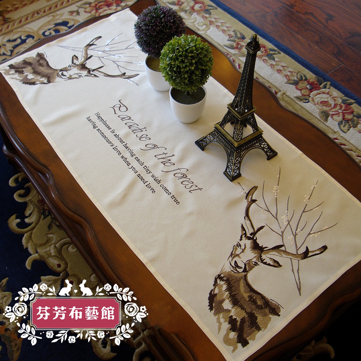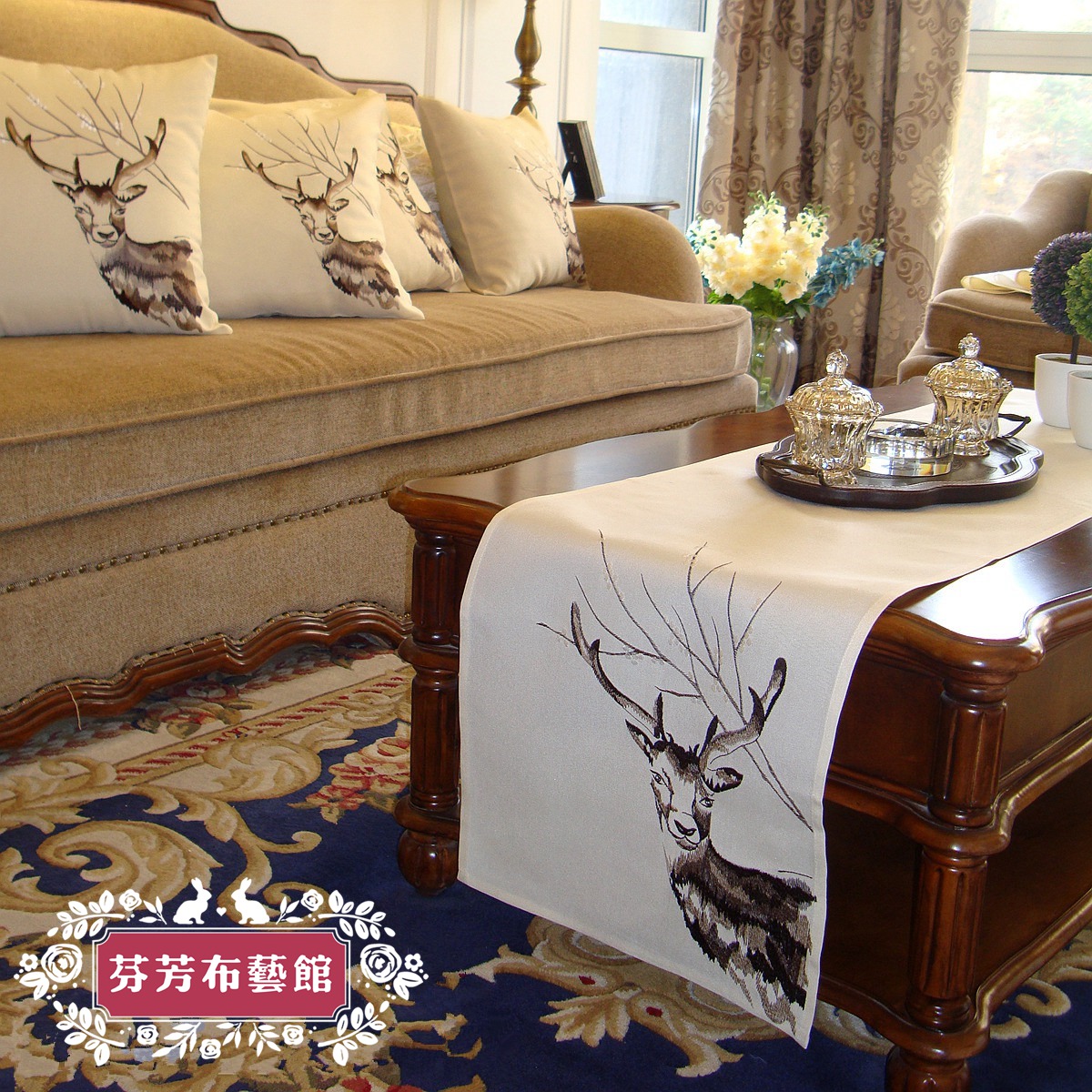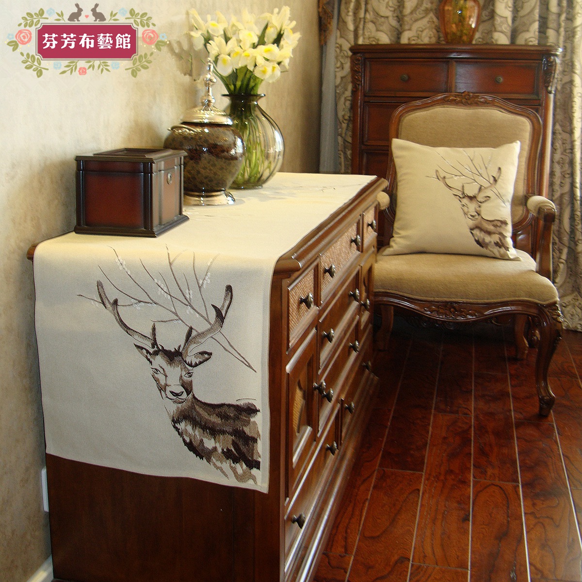 外贸美式乡村北欧居家刺绣麋鹿布艺桌旗桌带桌布茶几巾盖布餐垫
