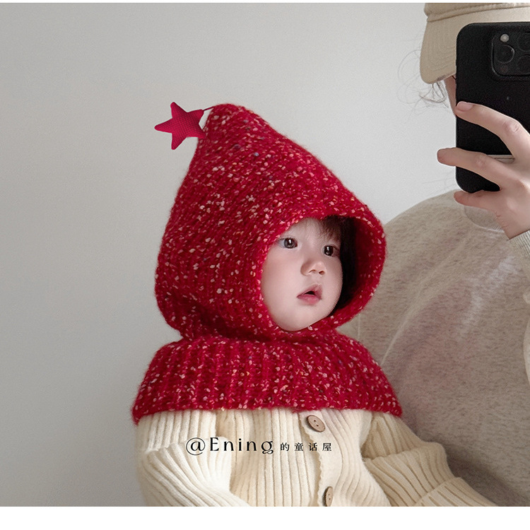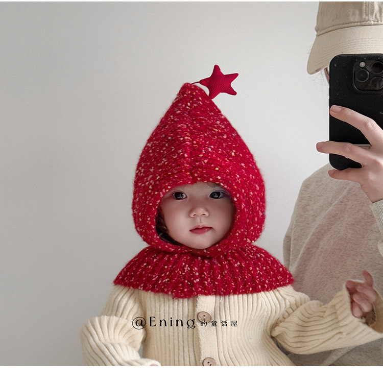 圣诞新年儿童针织帽子围脖一体男女宝宝婴儿护耳保暖精灵帽毛线帽