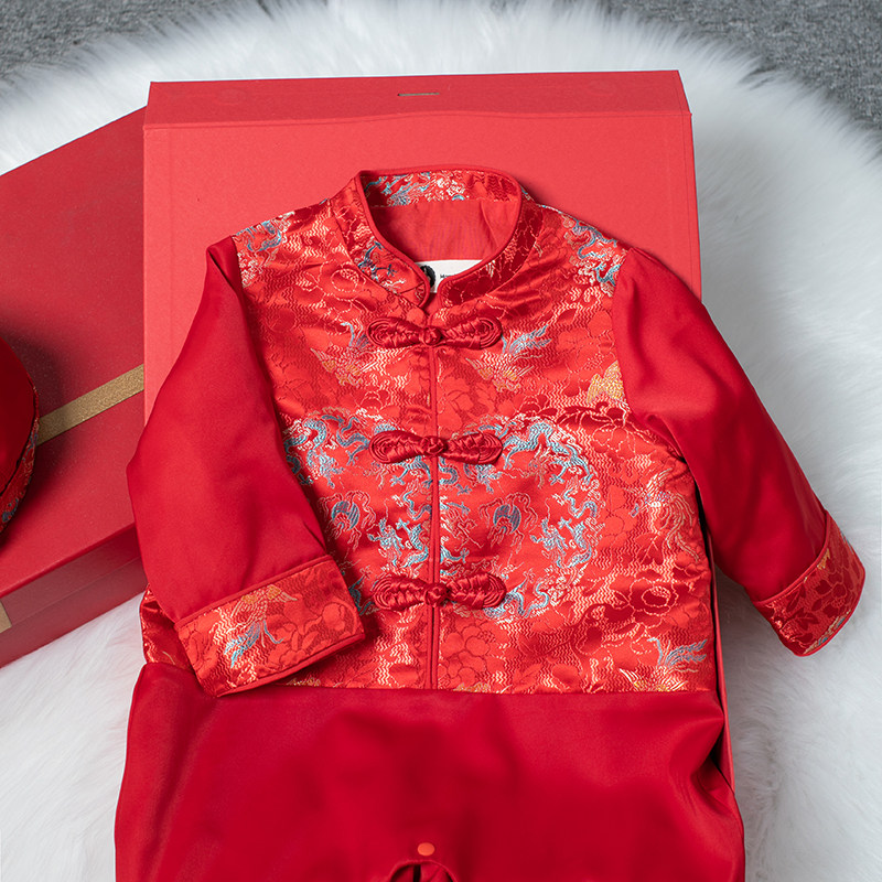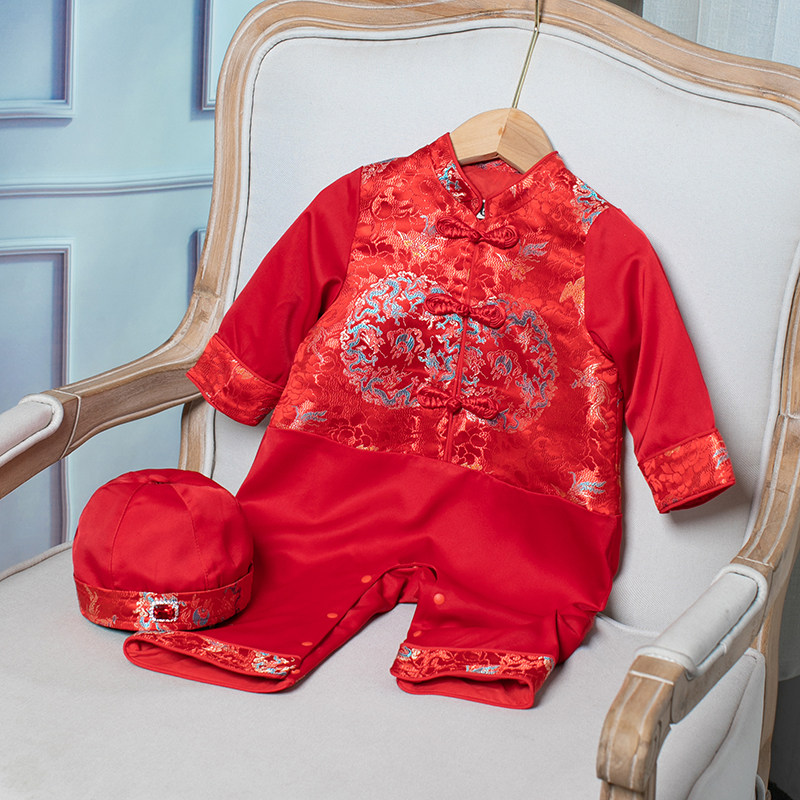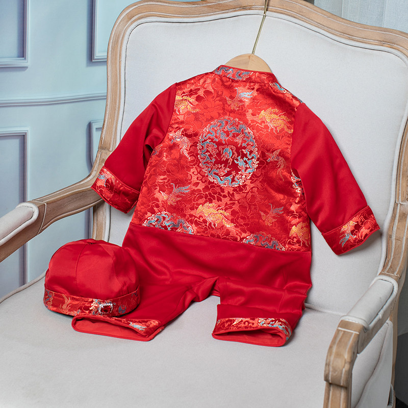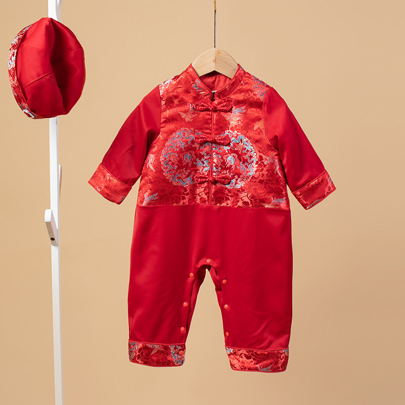 男宝宝周岁礼服红色连体衣长袖秋中国风抓周婴儿百天一岁冠衣唐装