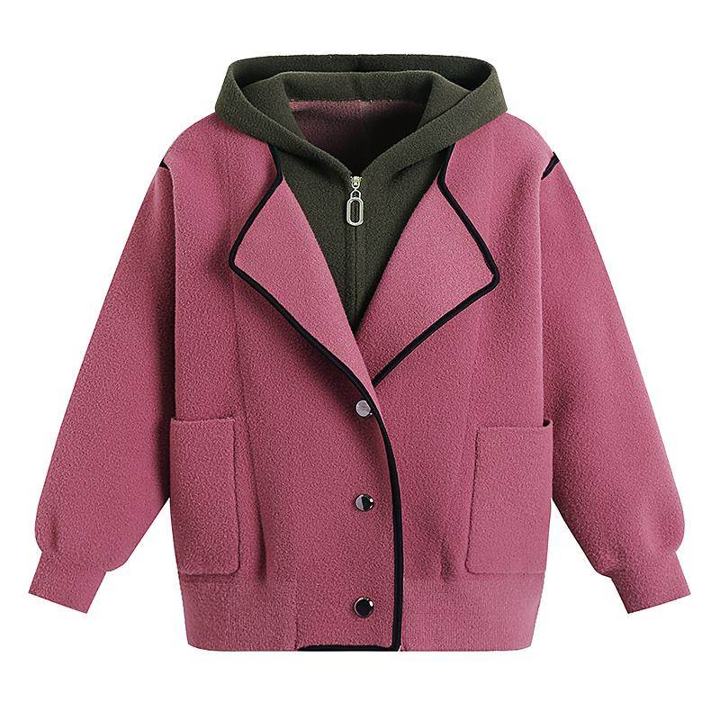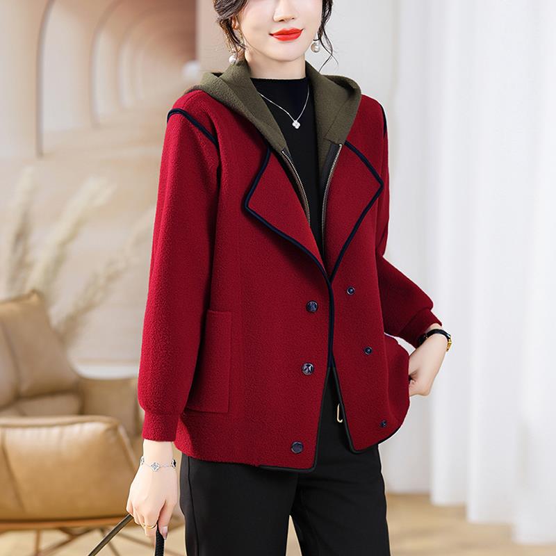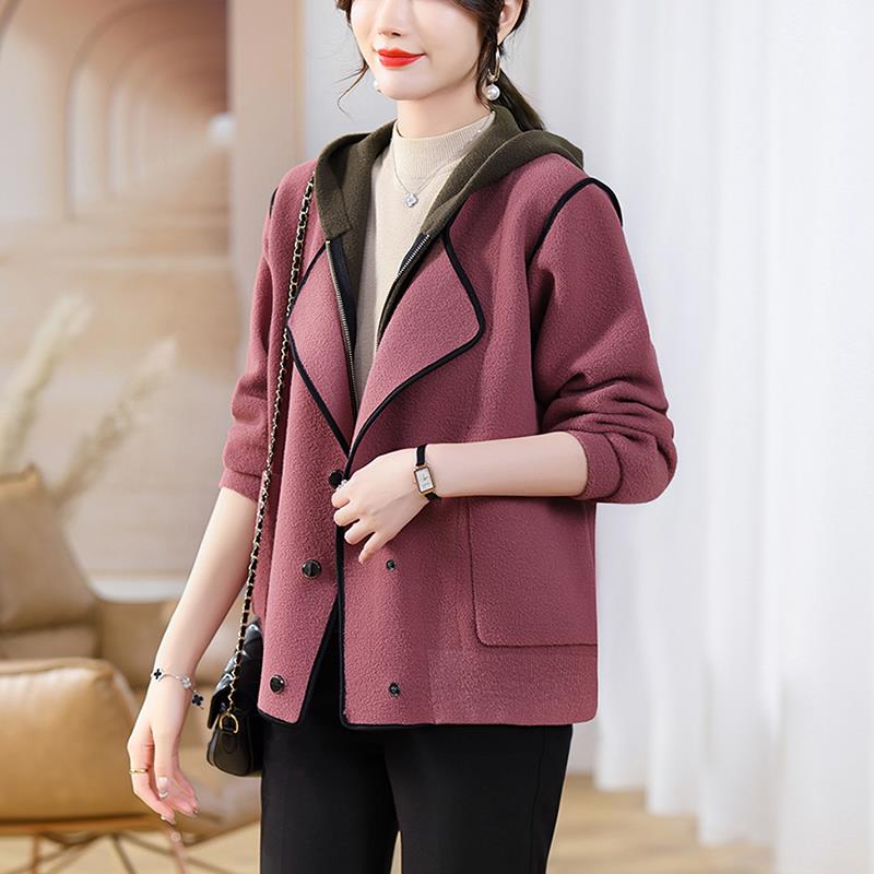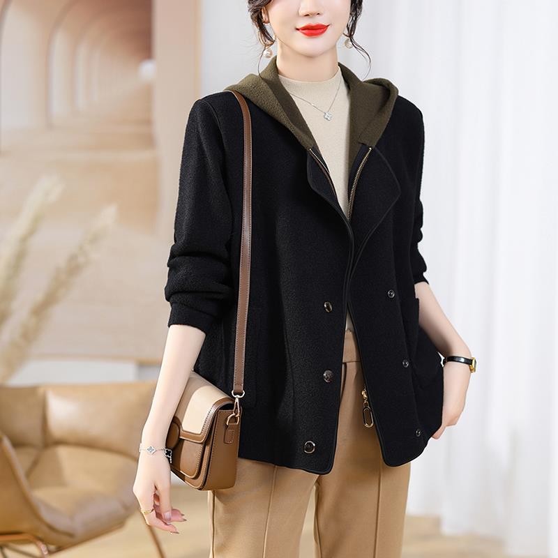 时尚西装领毛呢外套女士短款2025秋冬新款假两件开衫连帽羊绒大衣