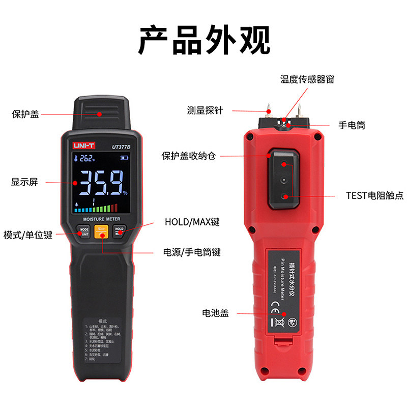 优利德插针式水份仪UT377B高精度木材水分测量仪混凝土含水率检测