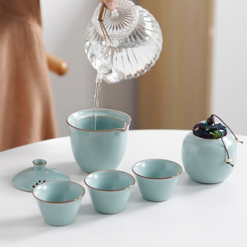 汝窑快客杯一壶三杯出差旅行简易茶具套装便携户外手提包办公室用