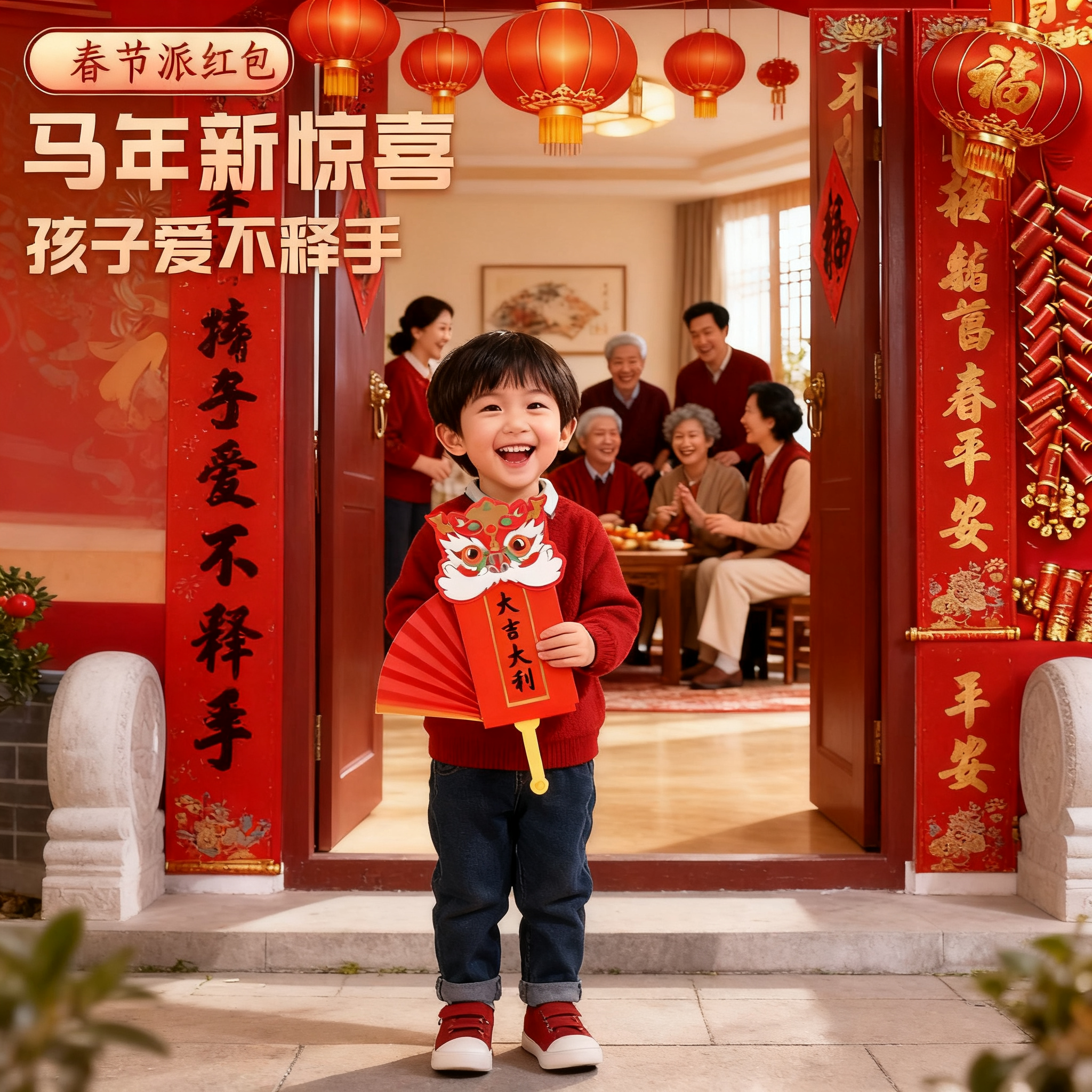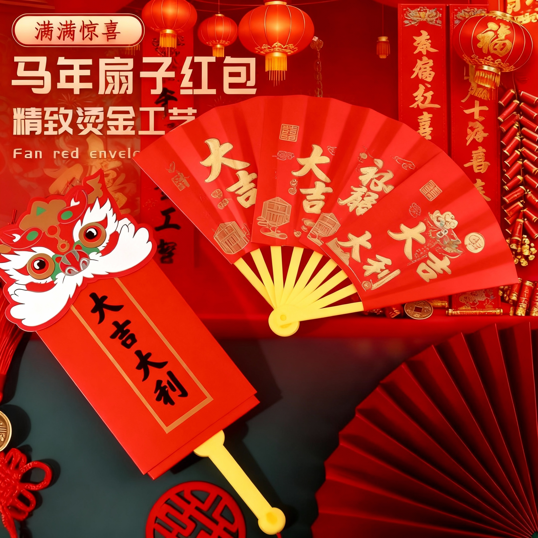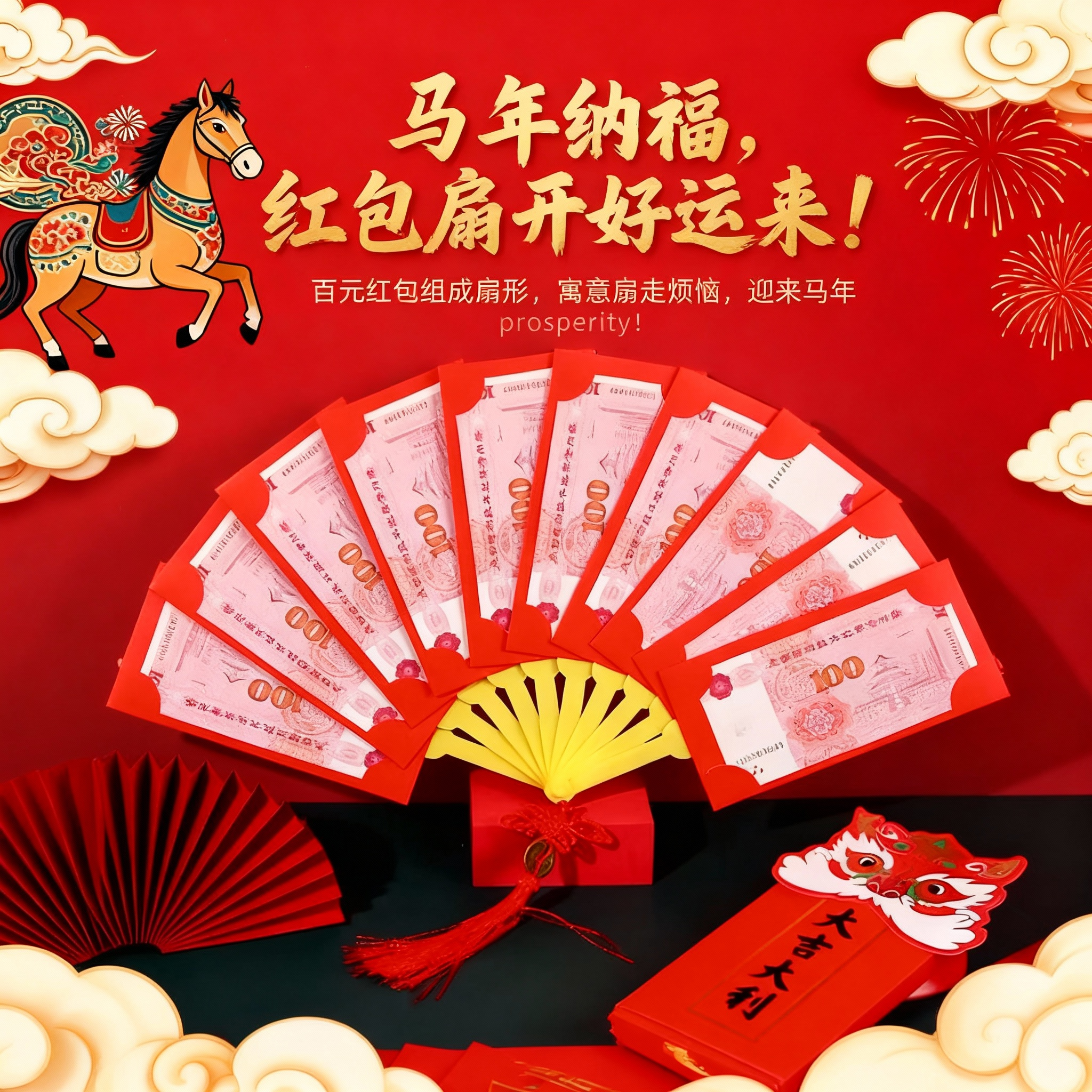 马年扇子红包2026年新款折叠创意国潮舞狮过年新年扇形压岁利是封