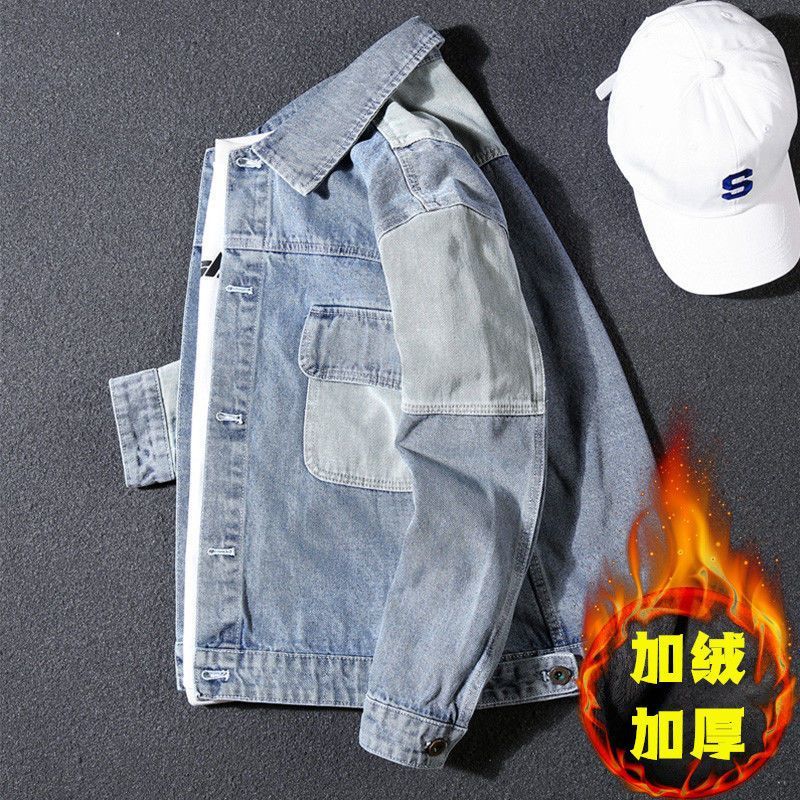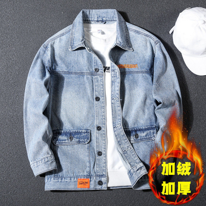 工装牛仔外套男加绒加厚秋冬复古烟灰色宽松大码胖子潮牌休闲夹克