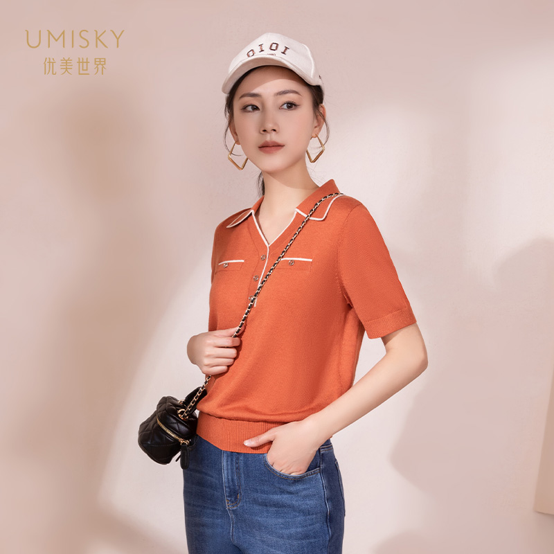 umisky优美世界专柜同款秋时尚简约V领拼色上衣套头毛衫SK3W3205