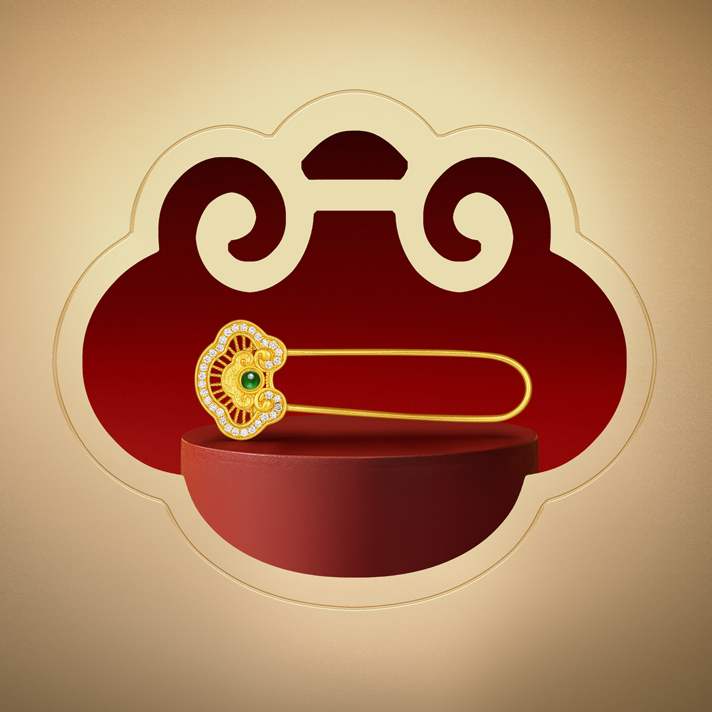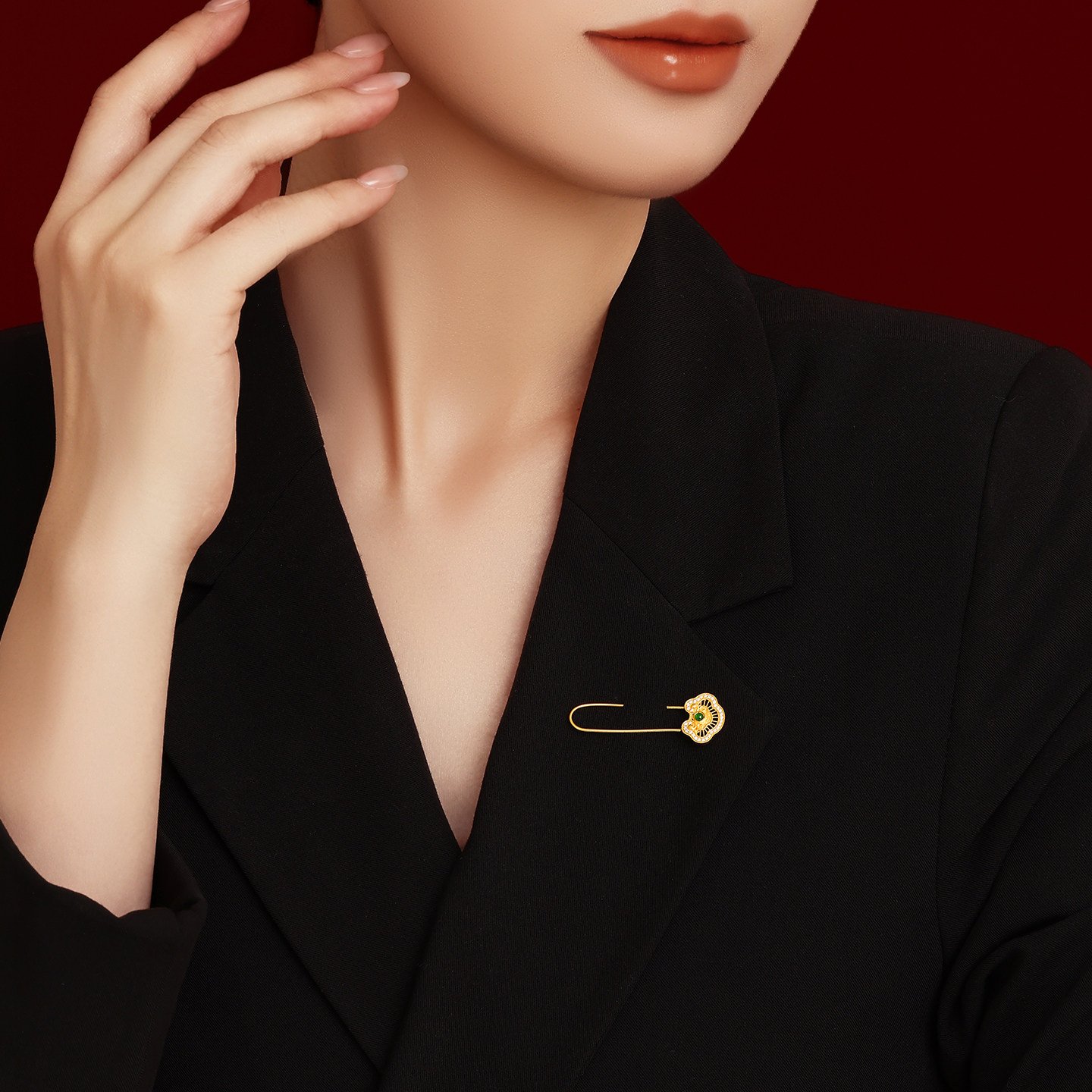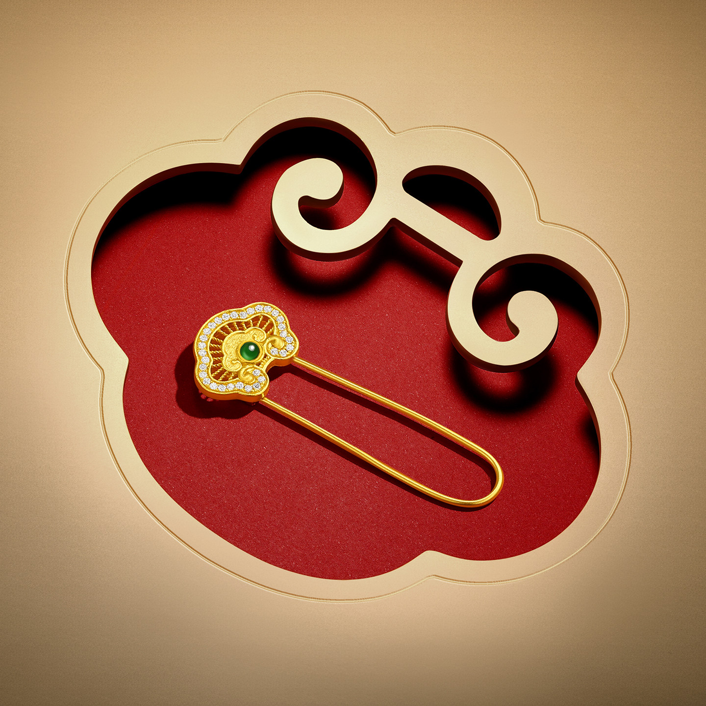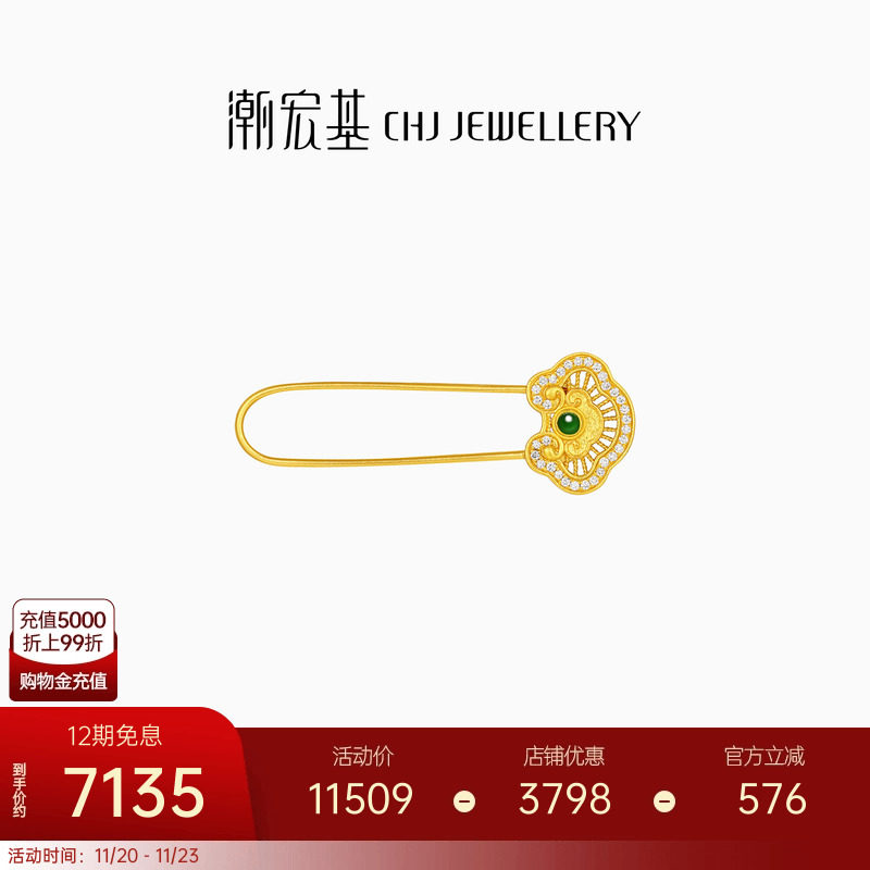 潮宏基如意臻锁足金钻石翡翠别针黄金胸针新中式国潮高奢礼物女