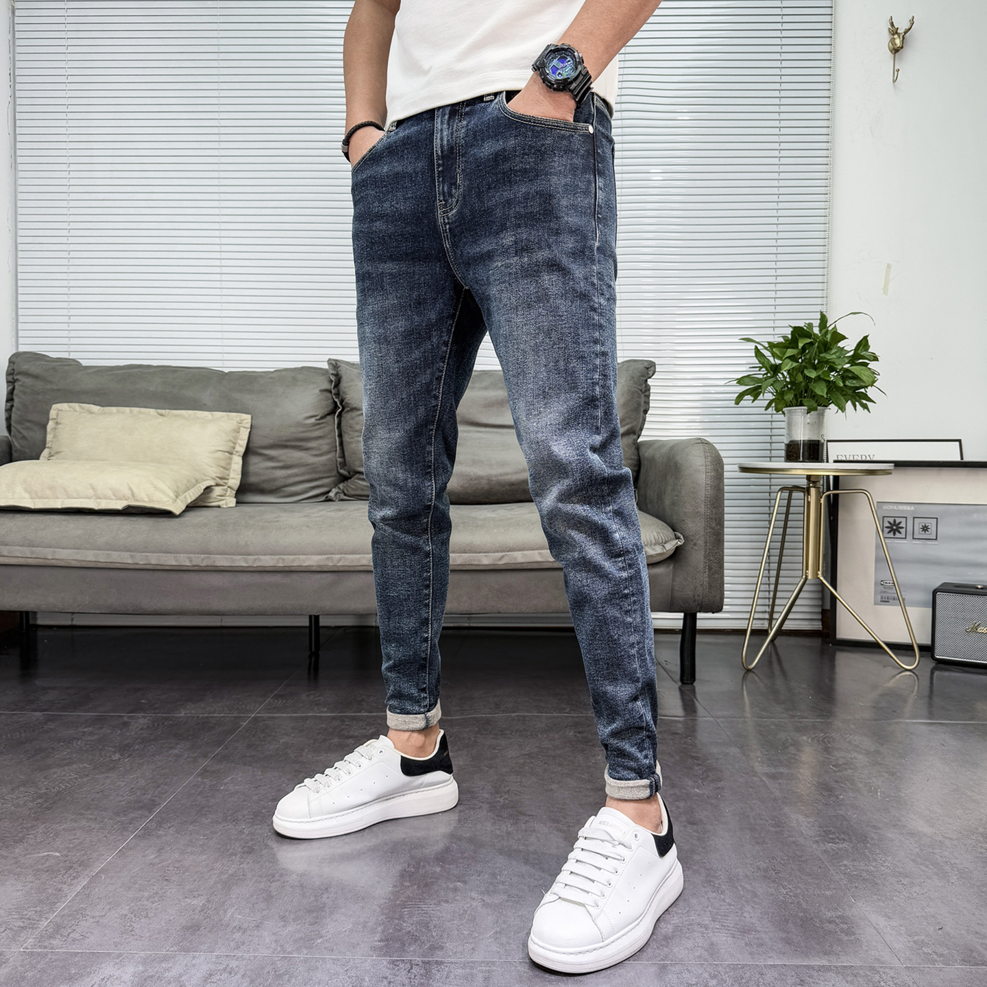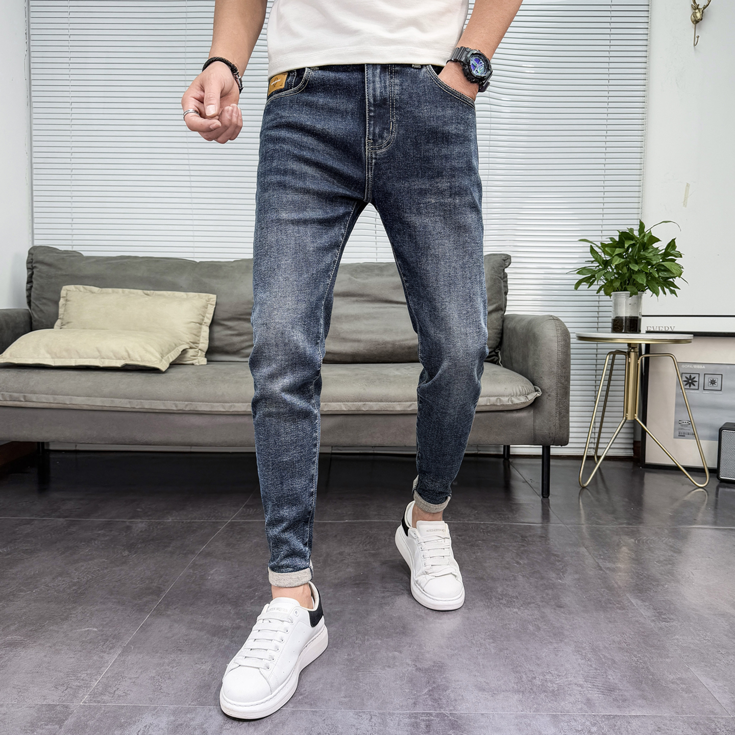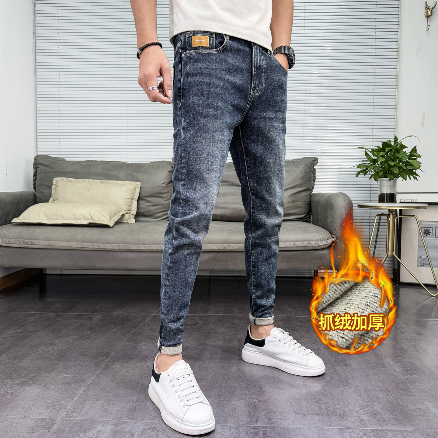新款牛仔裤男士秋冬季抓绒加厚修身小脚长裤潮流韩版百搭简单男款
