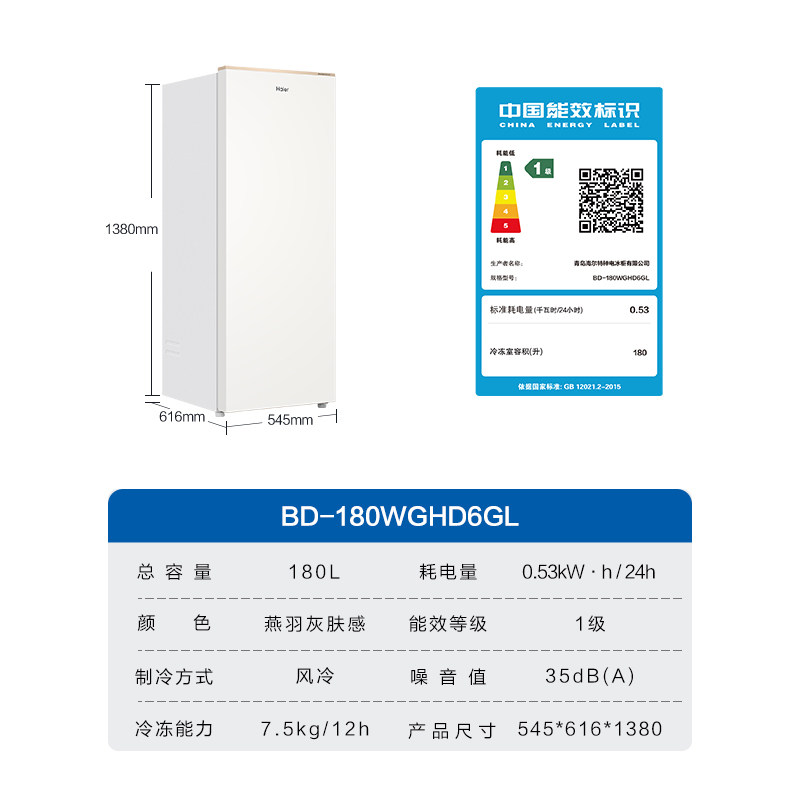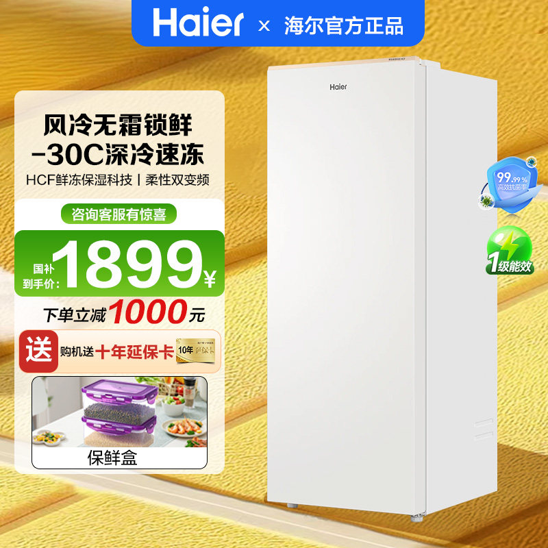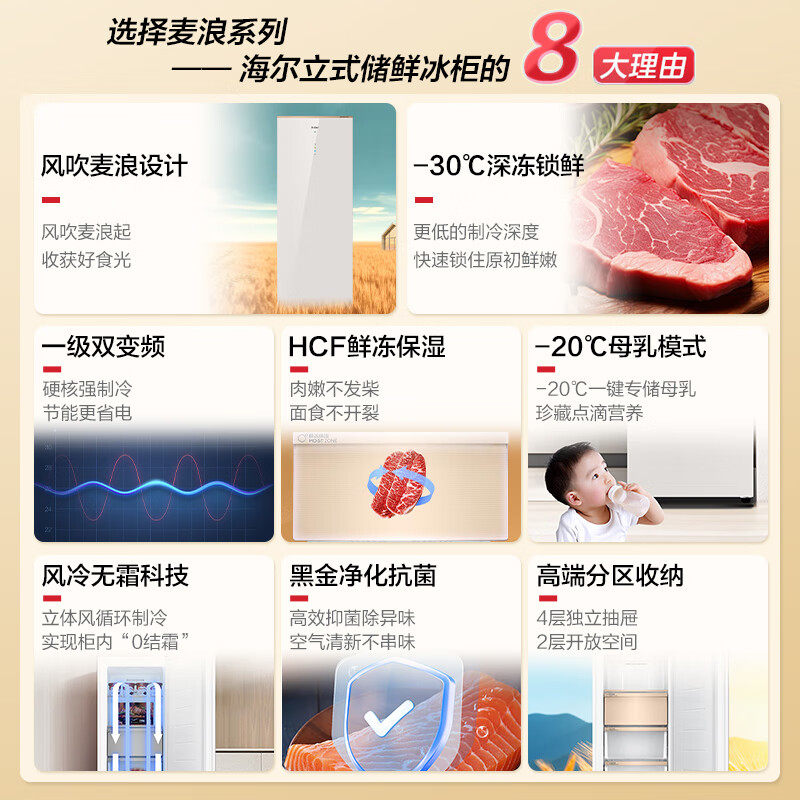海尔麦浪家用风冷无霜立式冷柜抽屉式180L全冷冻立式冰柜白色变频