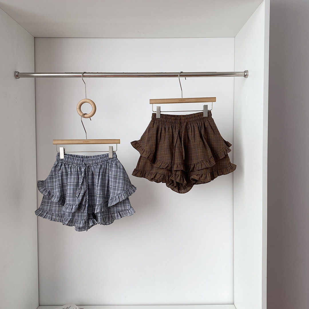 小众甜酷复古风松紧腰抽绳木耳边拼接A字阔腿短裤女春夏蛋糕短裤