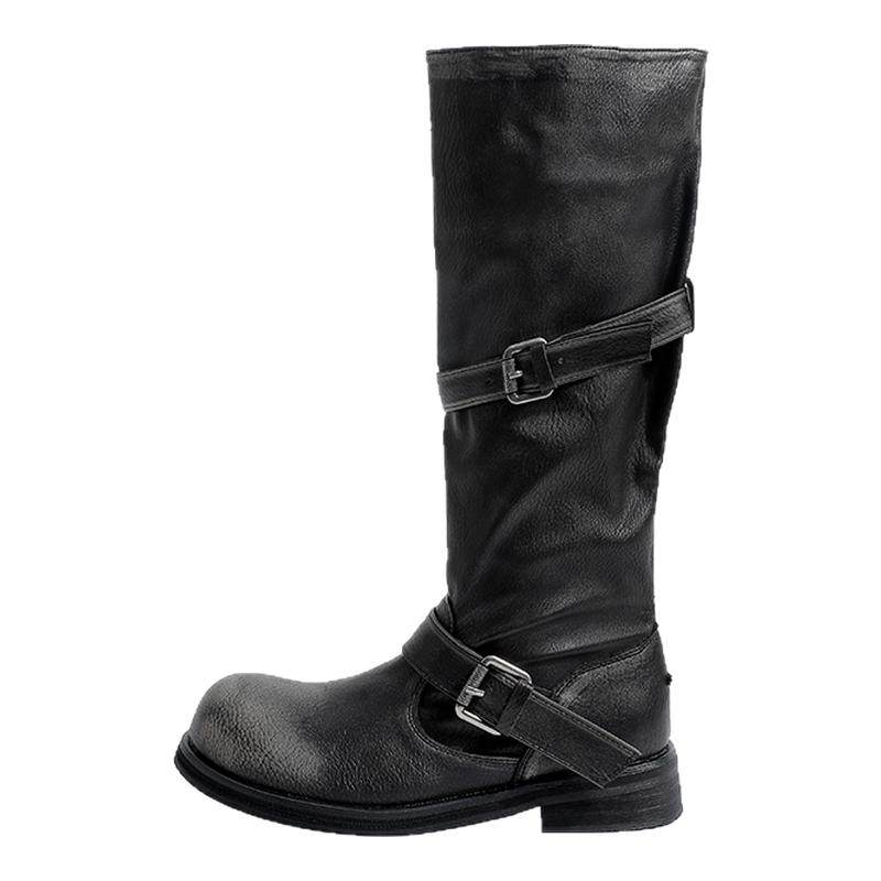 真皮~骄屿复古擦色做旧中筒机车靴粗跟短靴工装皮带扣棕色骑士靴
