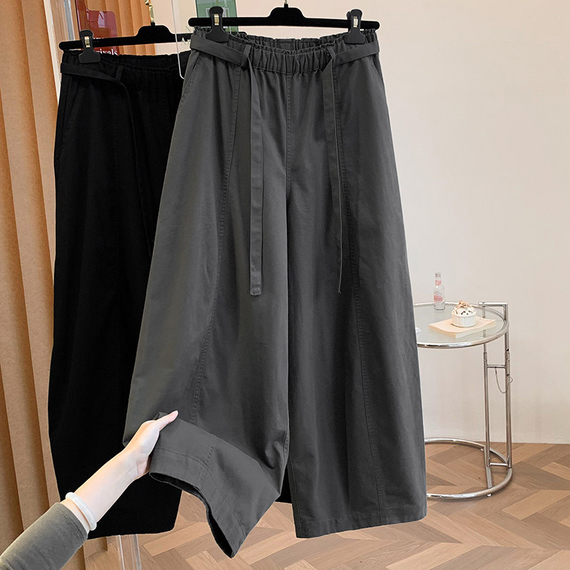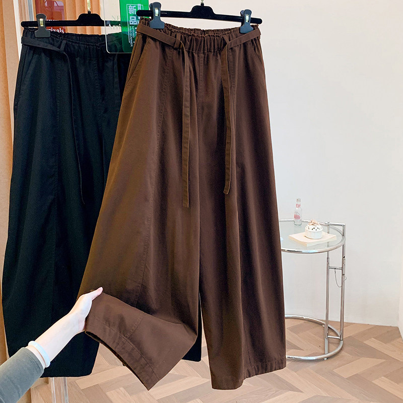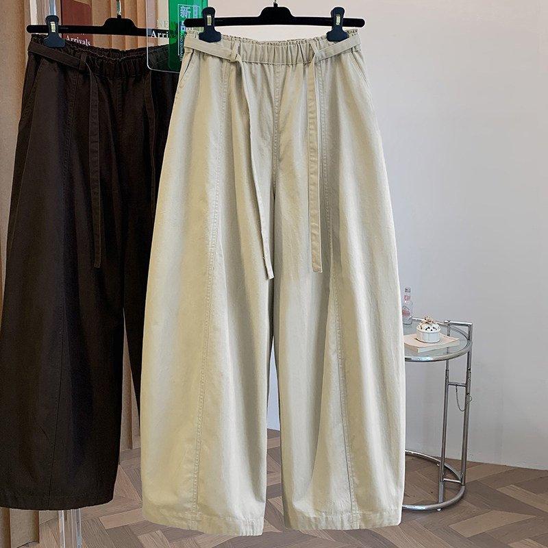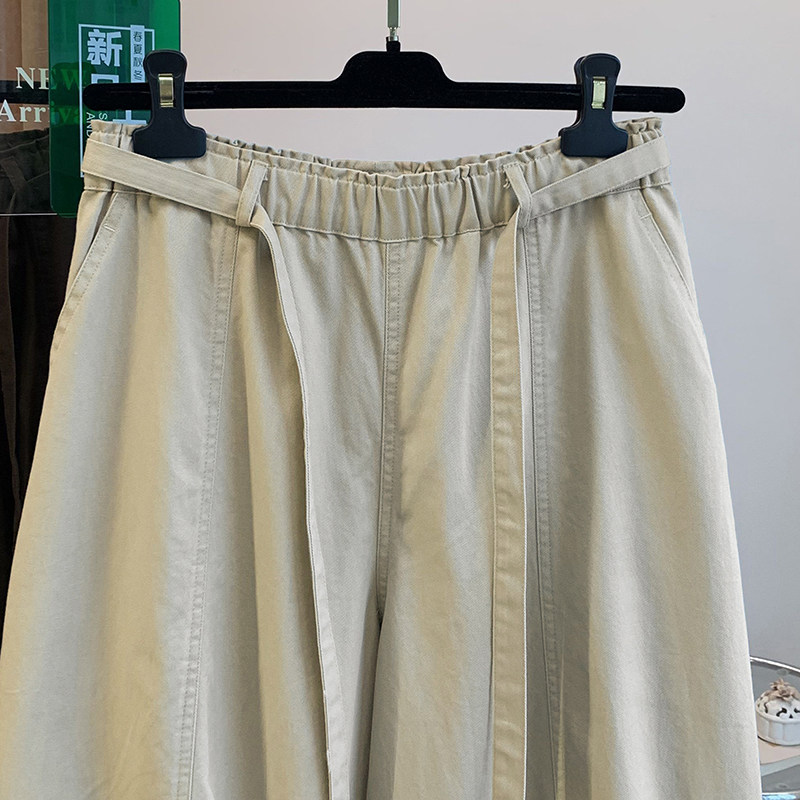 日系工装全棉休闲裤女春薄款宽松阔腿裤胖妹妹松紧腰抽绳显瘦长裤