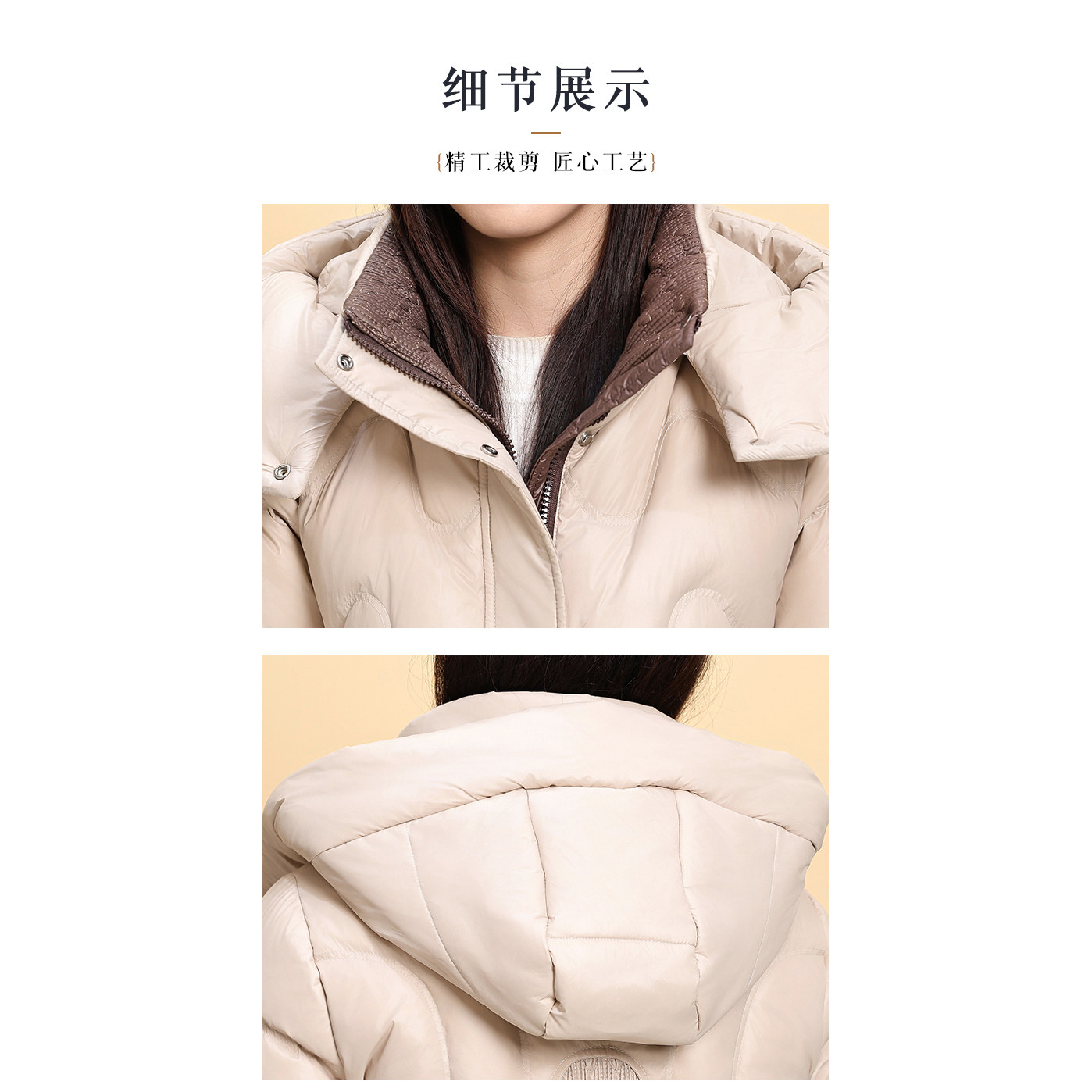 冬季带帽女士羽绒服修身保暖上衣冬装白鸭绒袄子中长款米色外套潮