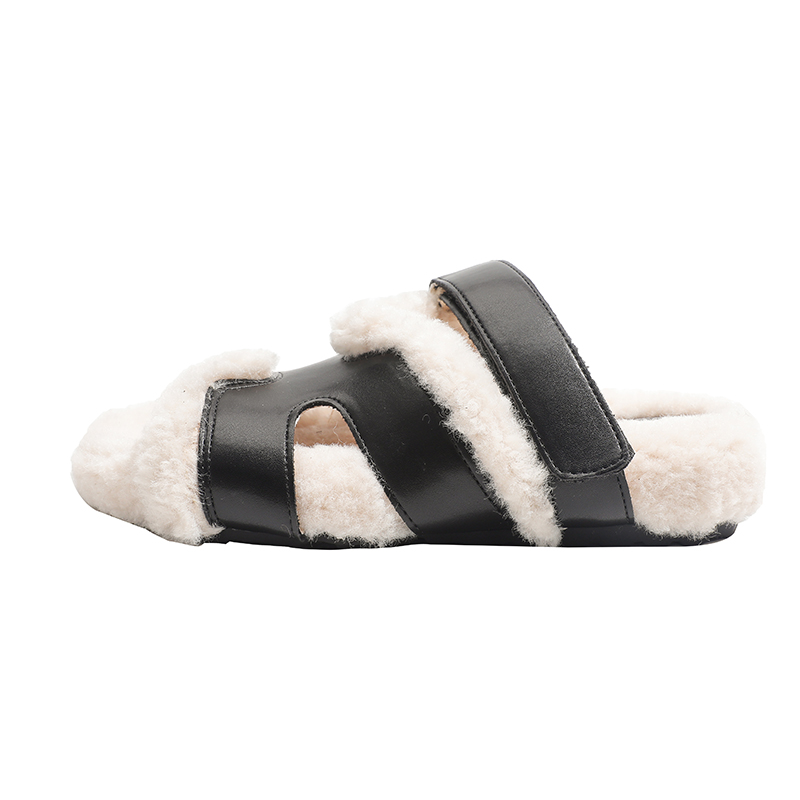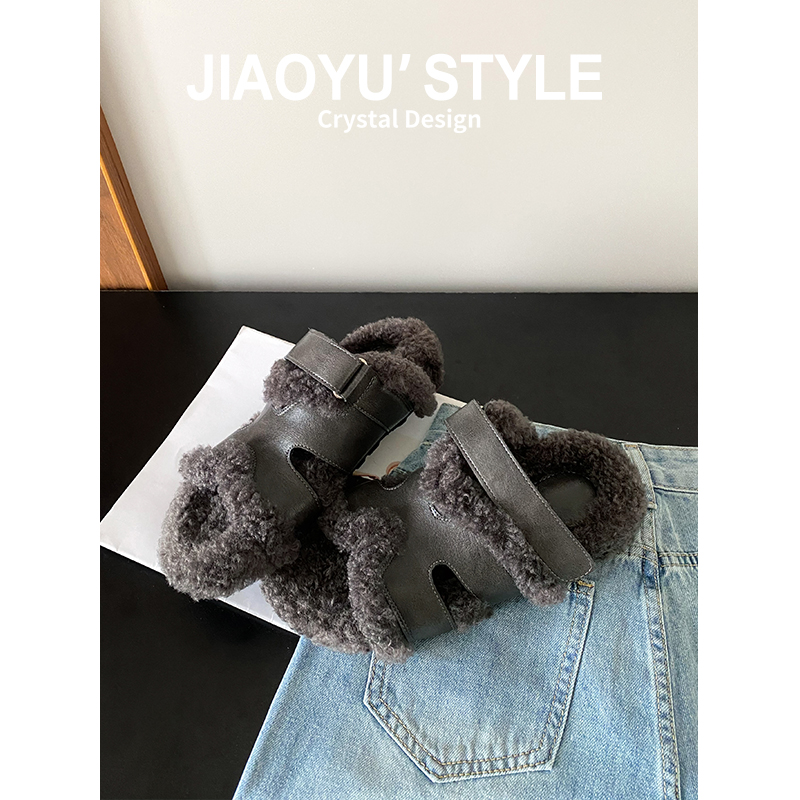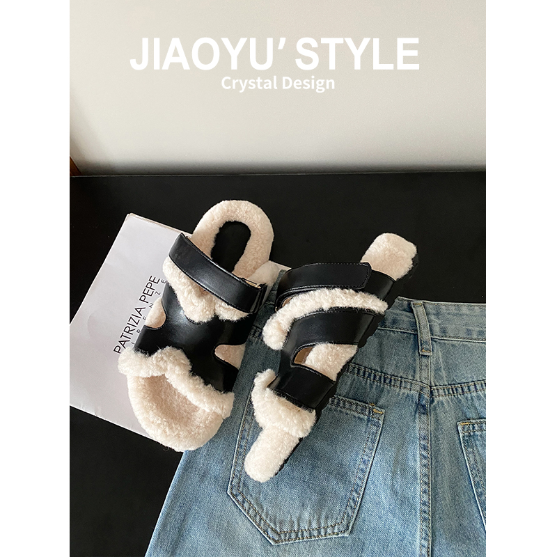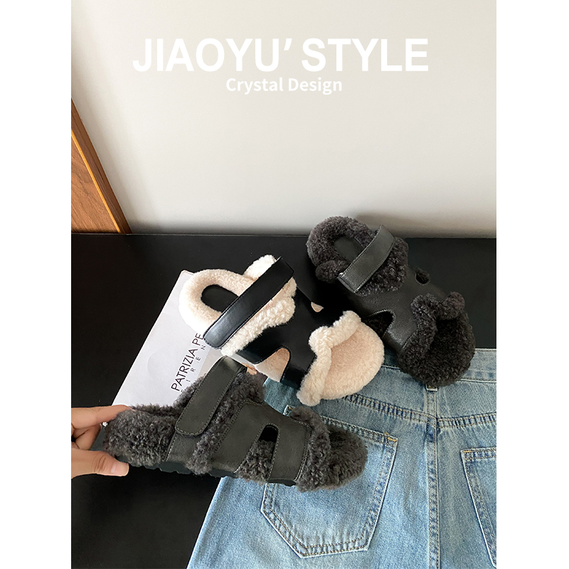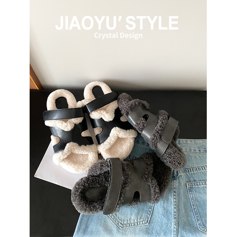 真皮~骄屿魔术贴厚底毛毛二舅拖鞋秋冬新款保暖露趾一字拖鞋外穿