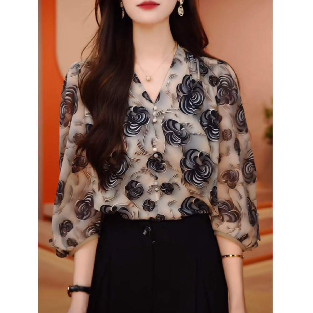 夏季薄款法式V领印花雪纺衬衫女士宽松高级感七分袖小衫妈妈上衣
