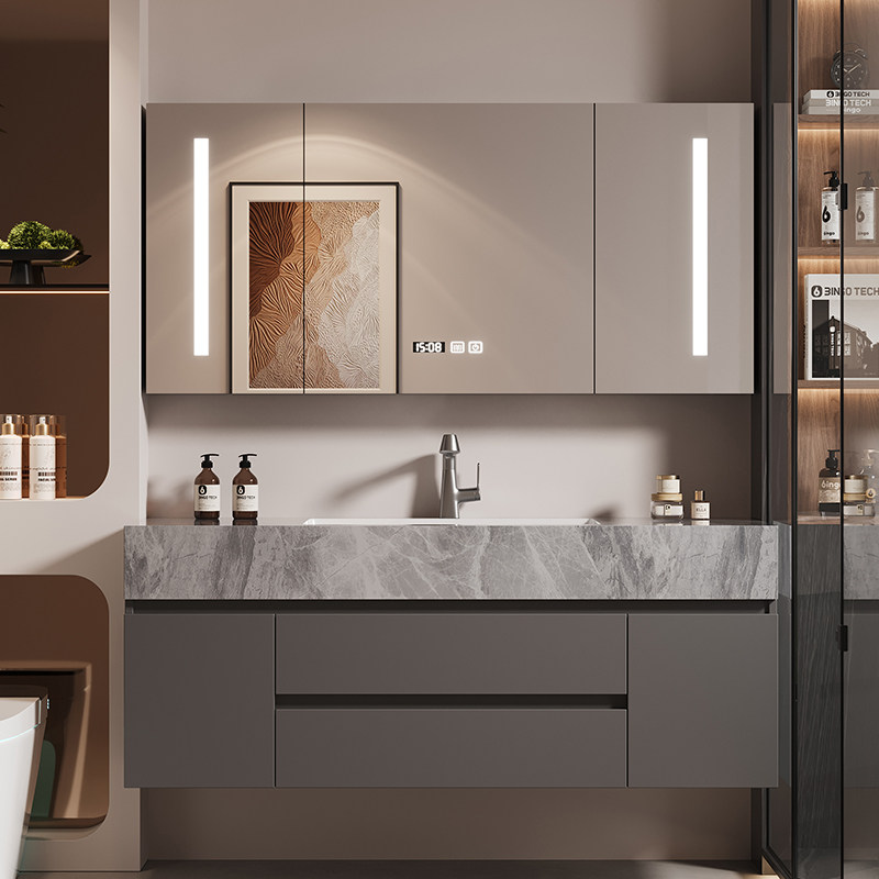 岩板无缝陶瓷一体盆轻奢智能浴室柜组合挂墙式洗漱台洗手盆洗脸盆