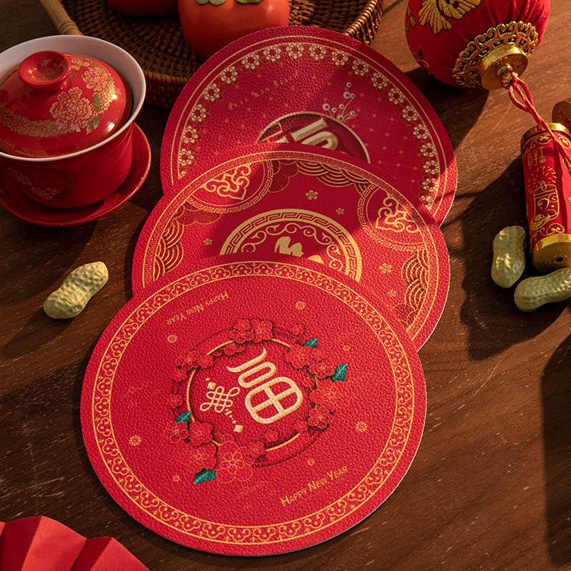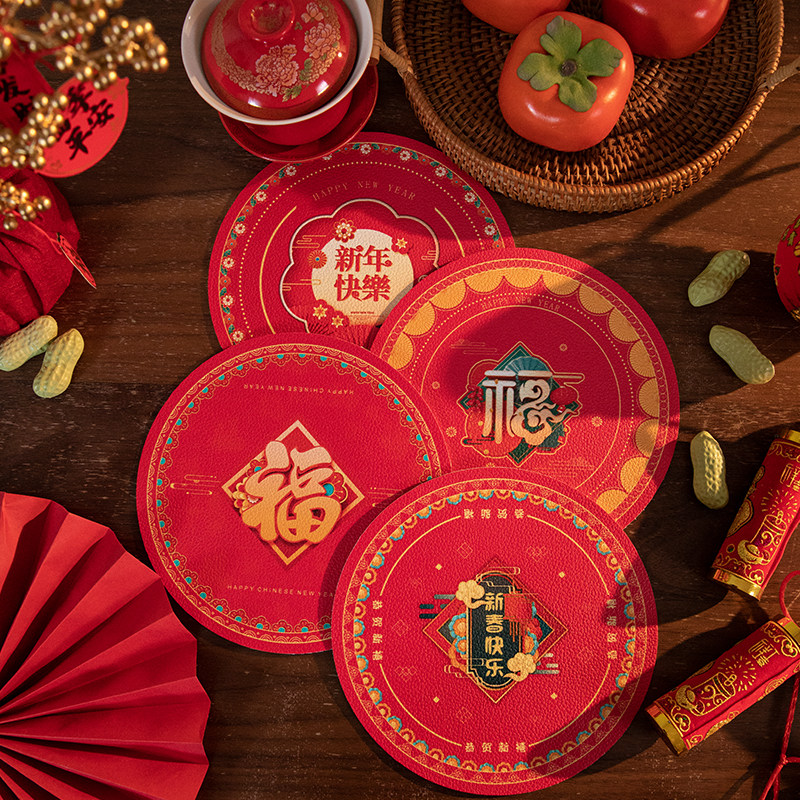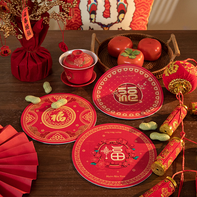 餐桌隔热垫喜迎新年红色圆形碗盘垫PVC皮革餐垫定制福字大桌垫子