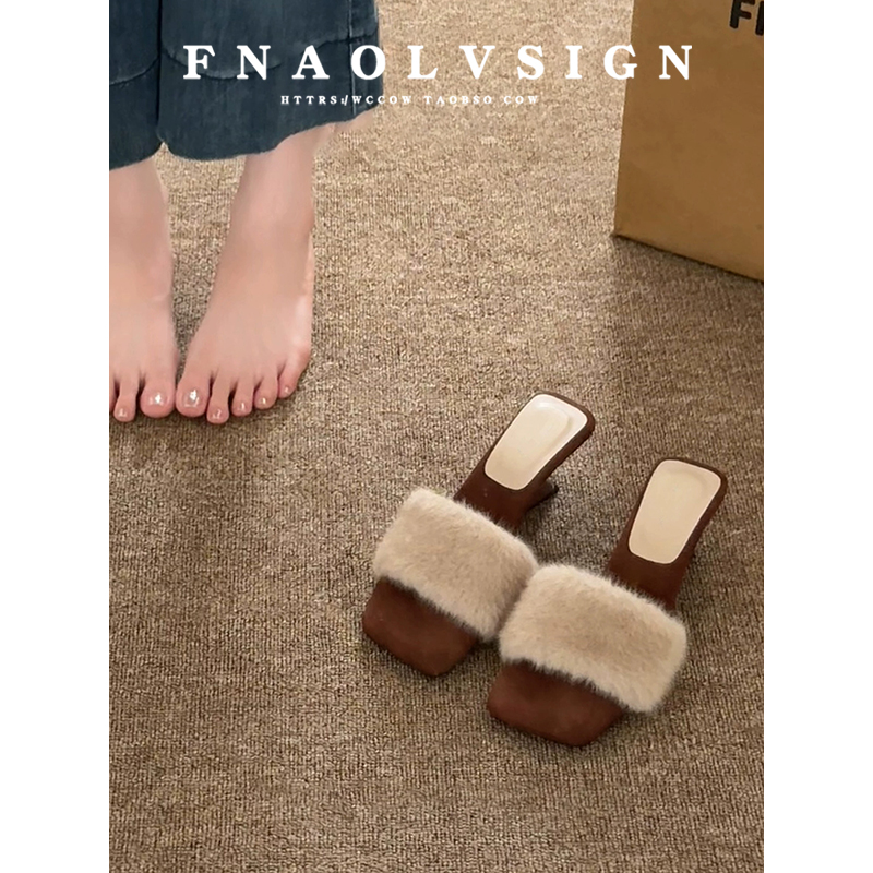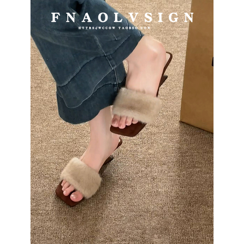 羊皮版~法式名媛高跟毛毛一字拖鞋女仙女风坡跟露趾方头凉拖鞋女