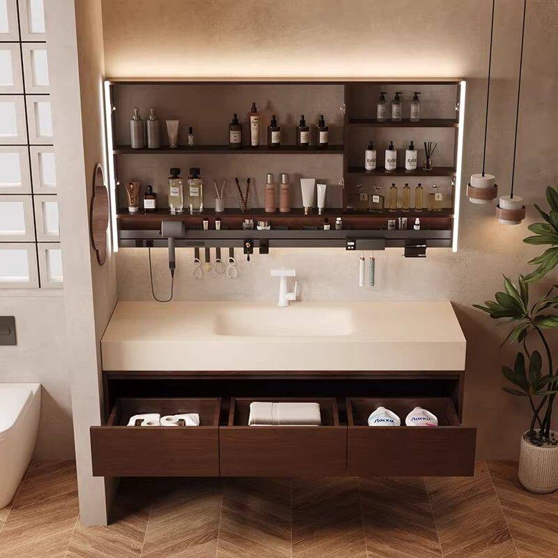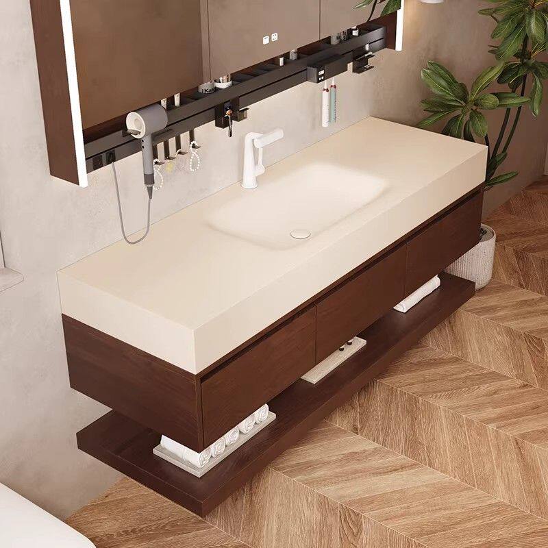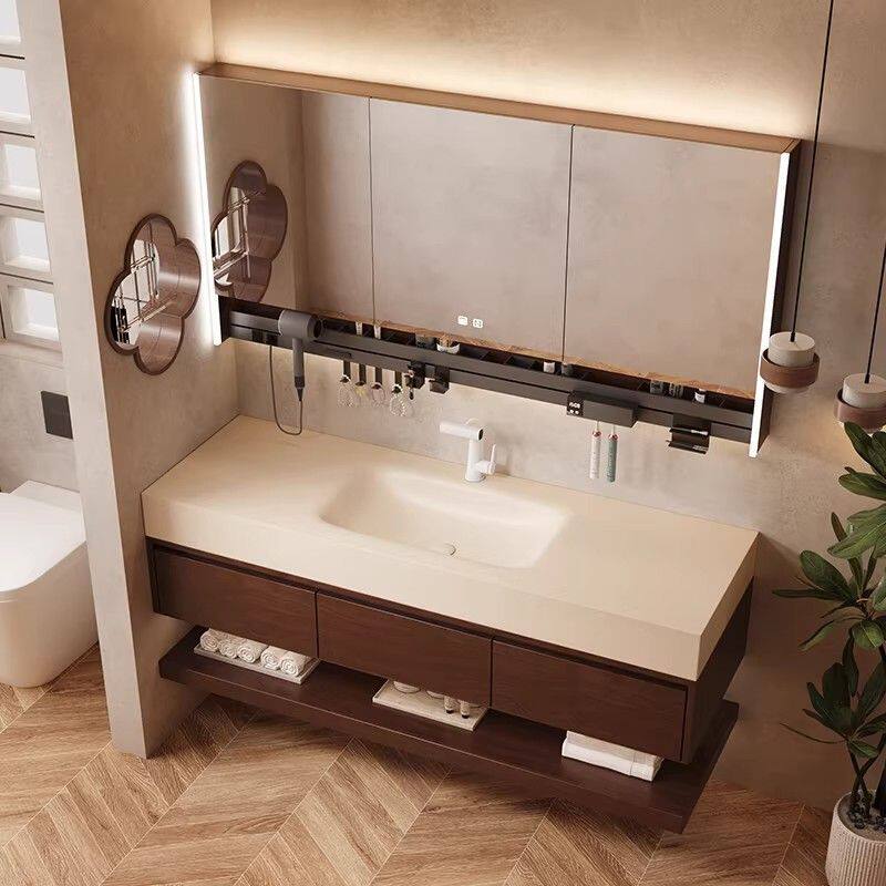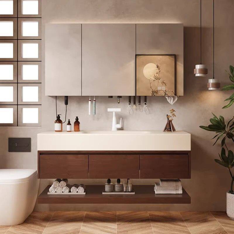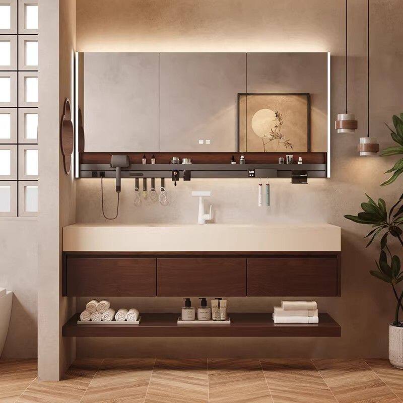 莫顿中古风岩板热弯一体盆胡桃木色浴室柜组合可定制卫生间浴室柜