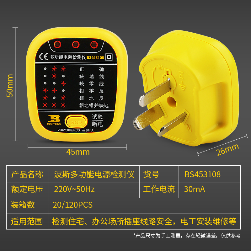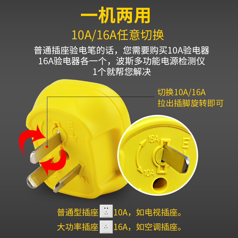 波斯工具10A/16A验电器插座测试仪漏电地线电源极性相位检测仪