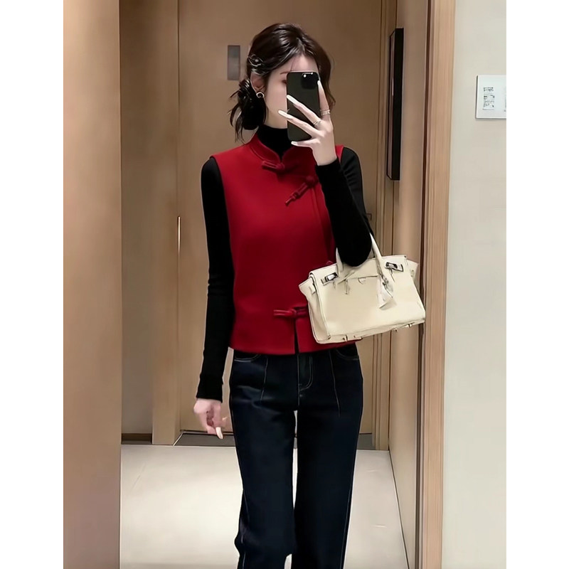 2026春秋新款打底衫女纯色半高领+旗袍半袖马甲新年套装百搭长袖