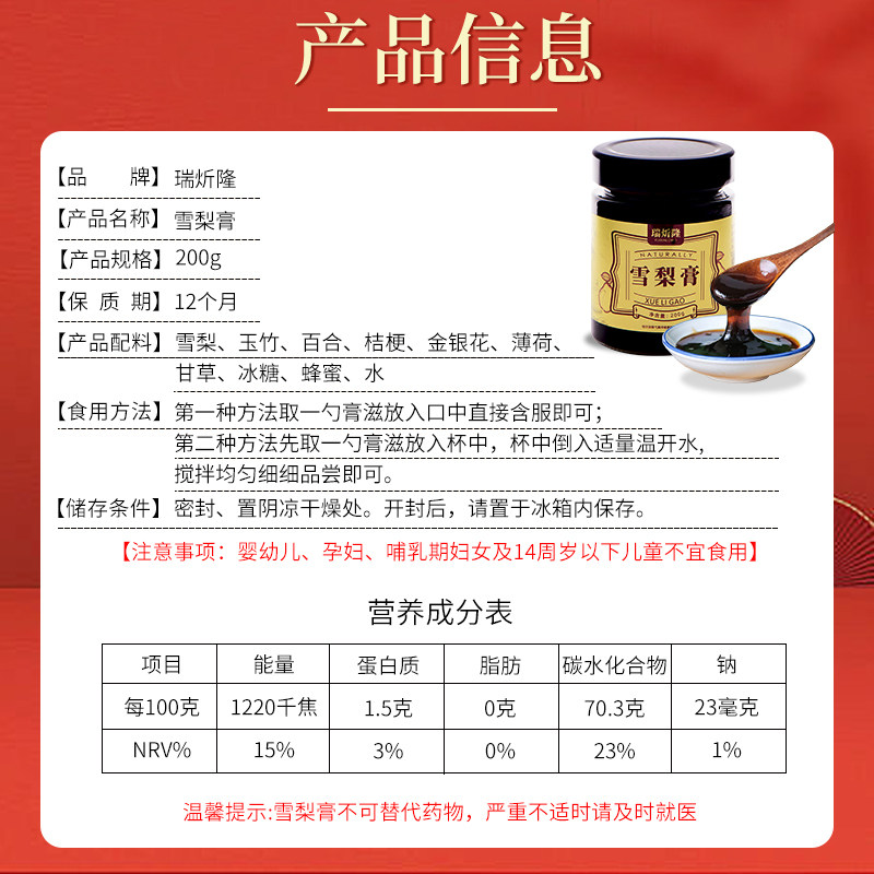 瑞炘隆 雪梨膏200g/瓶老人儿童润嗓营养健康古法调理【顺丰包邮】