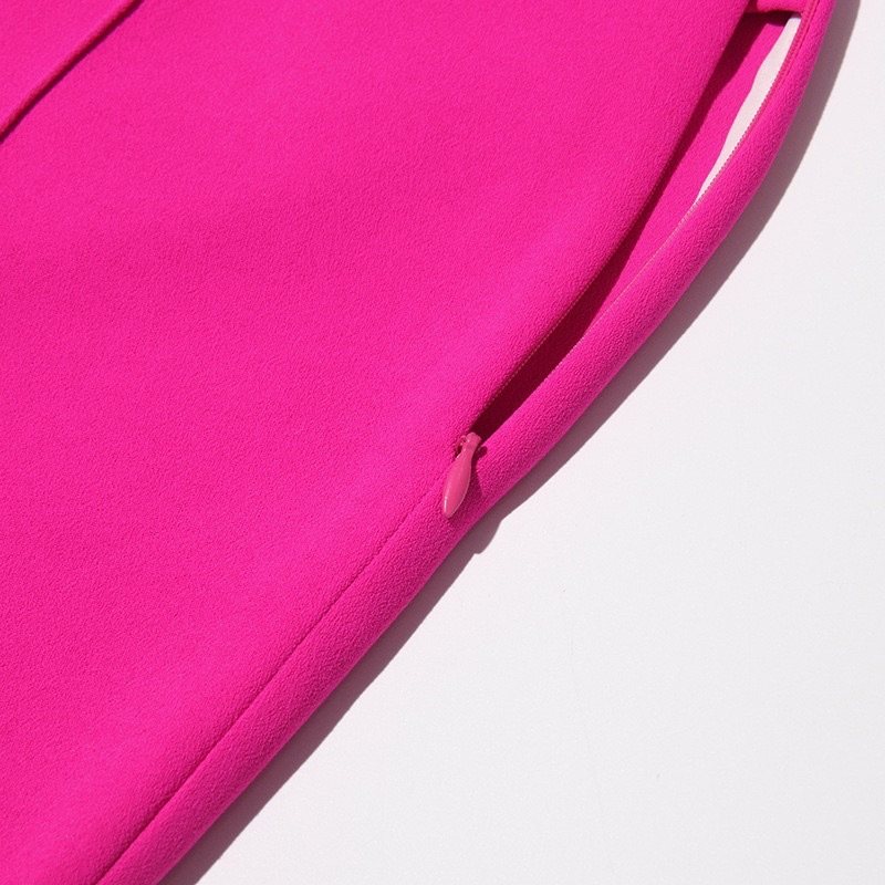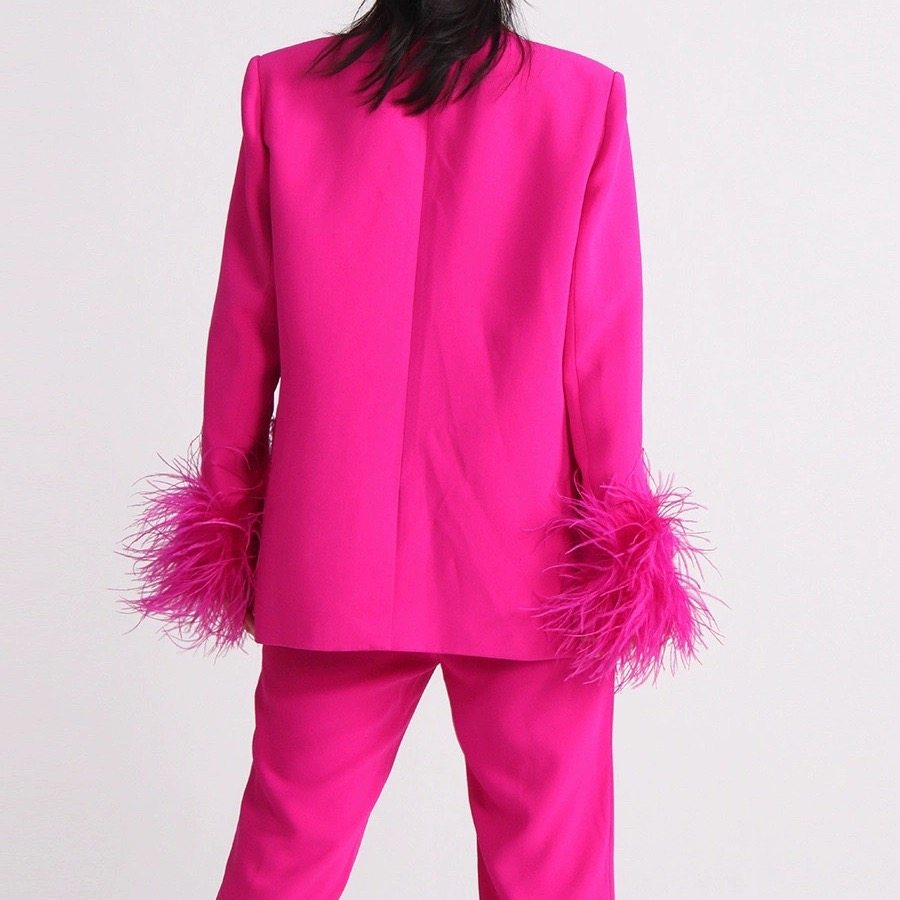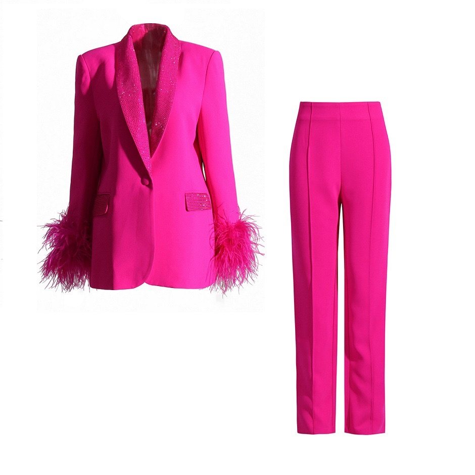 玫红色羽毛袖口镶钻青果领西装+铅笔裤长裤两件套简约优雅OL套装