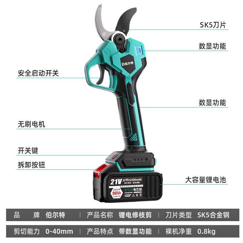 伯尔特40mm无刷电动剪刀树枝电剪刀修枝剪园林果树花椒充电粗枝剪