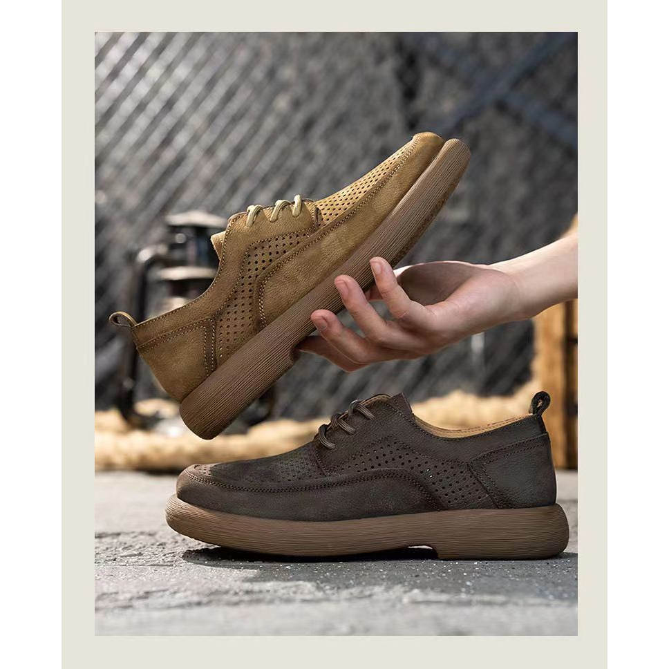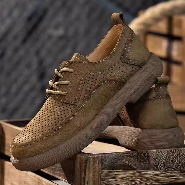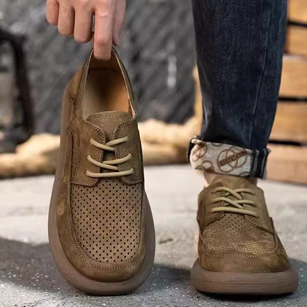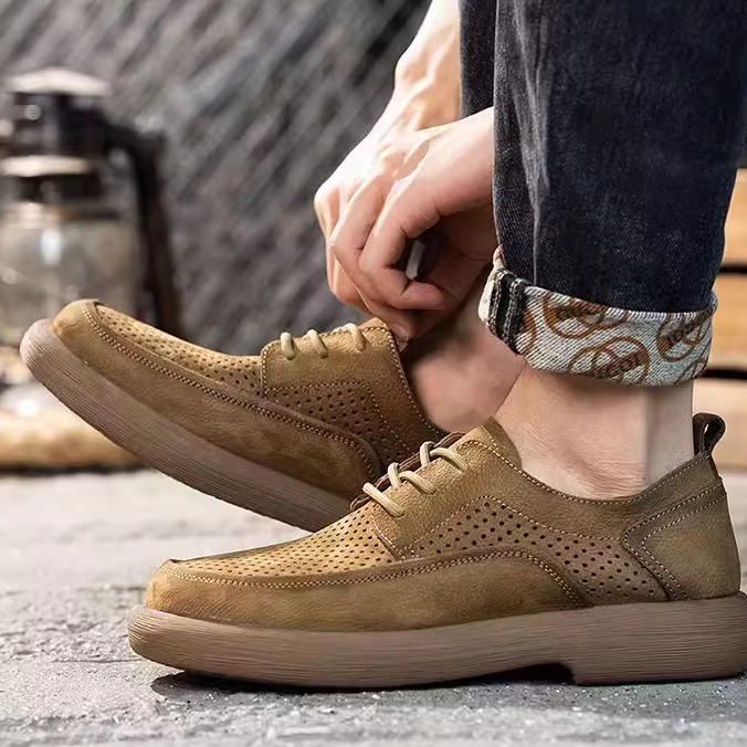 休闲皮鞋男2025新款夏季镂空凉鞋子真皮透气复古运动休闲男士板鞋