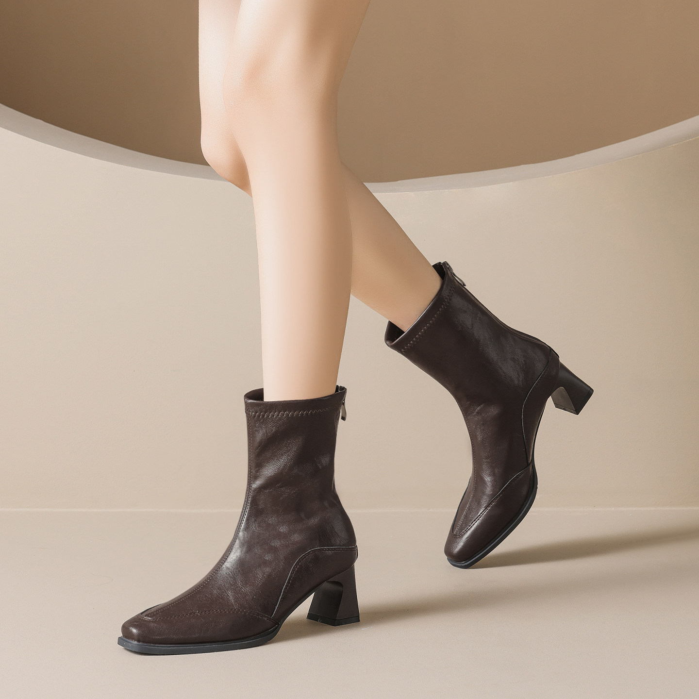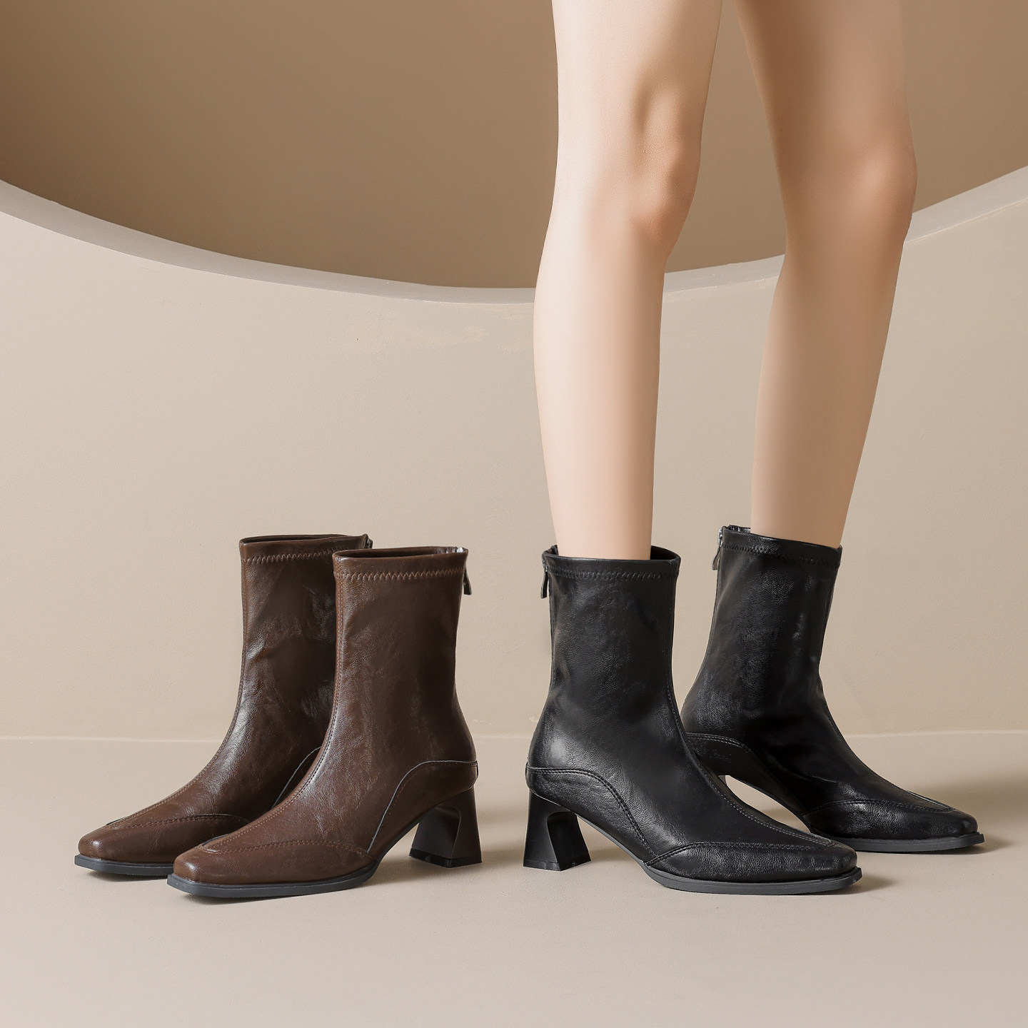 真皮~高跟鞋短靴女冬方头马丁靴黑色加绒粗跟弹力瘦瘦靴大码女鞋