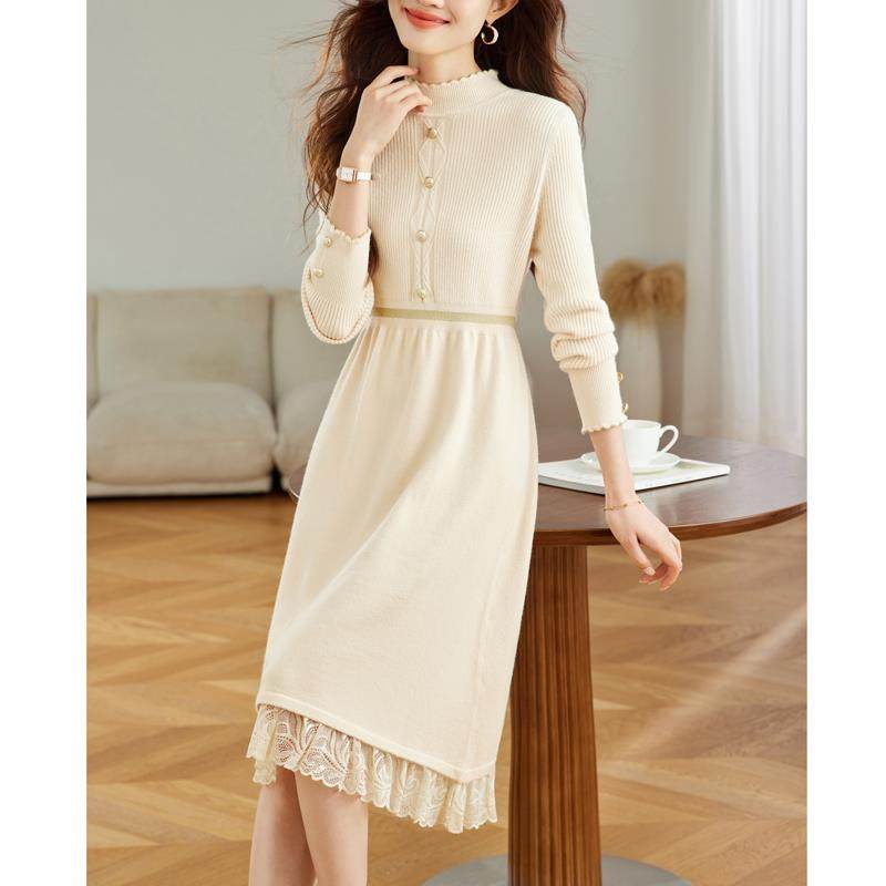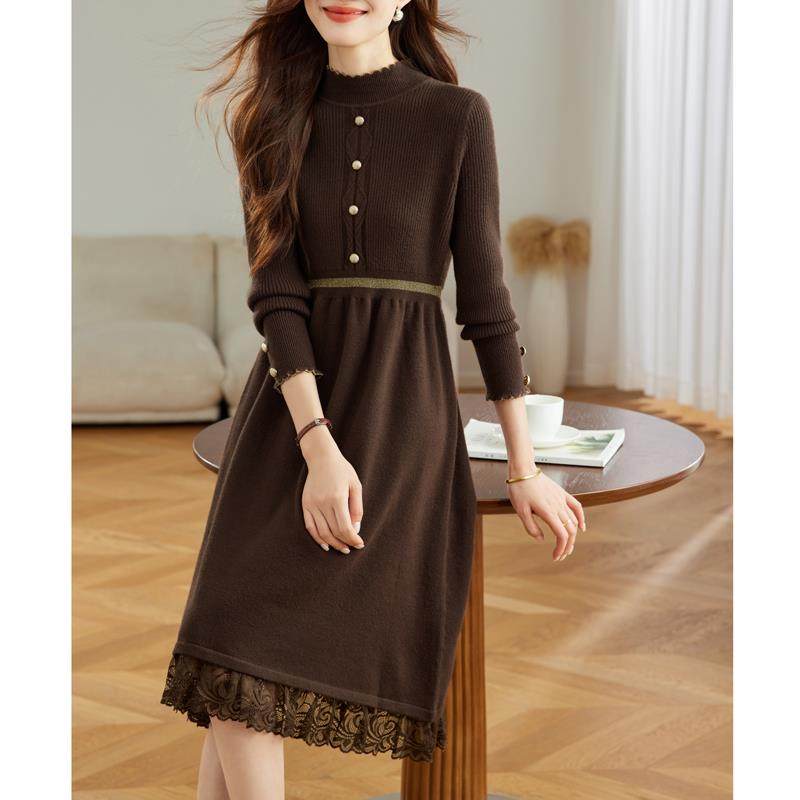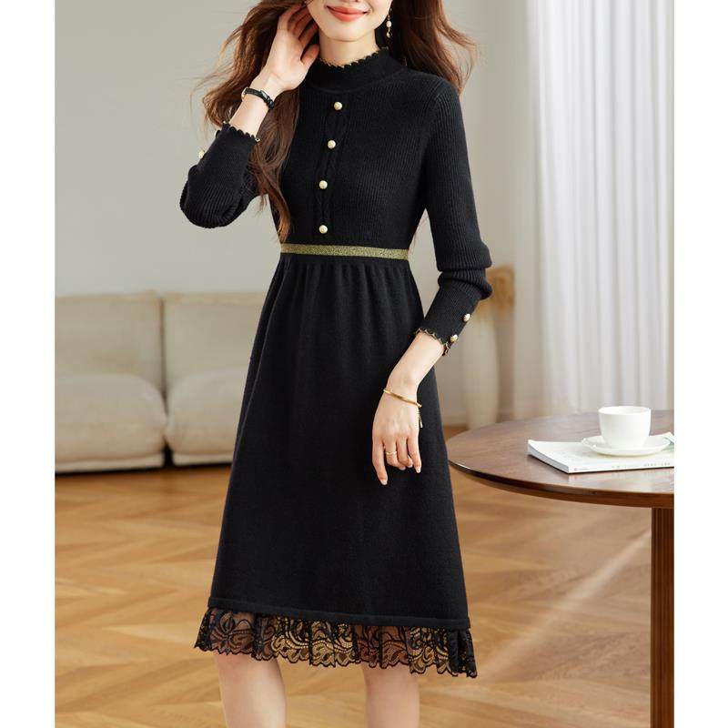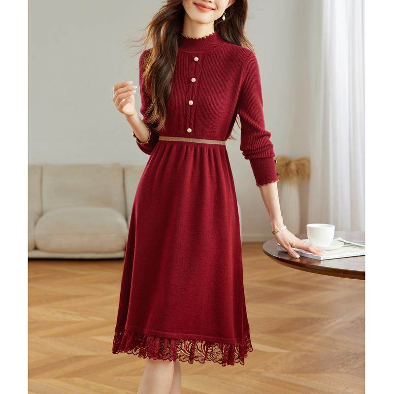 2025新款针织打底连衣裙女士秋冬配大衣红色内搭中长款蕾丝毛衣裙