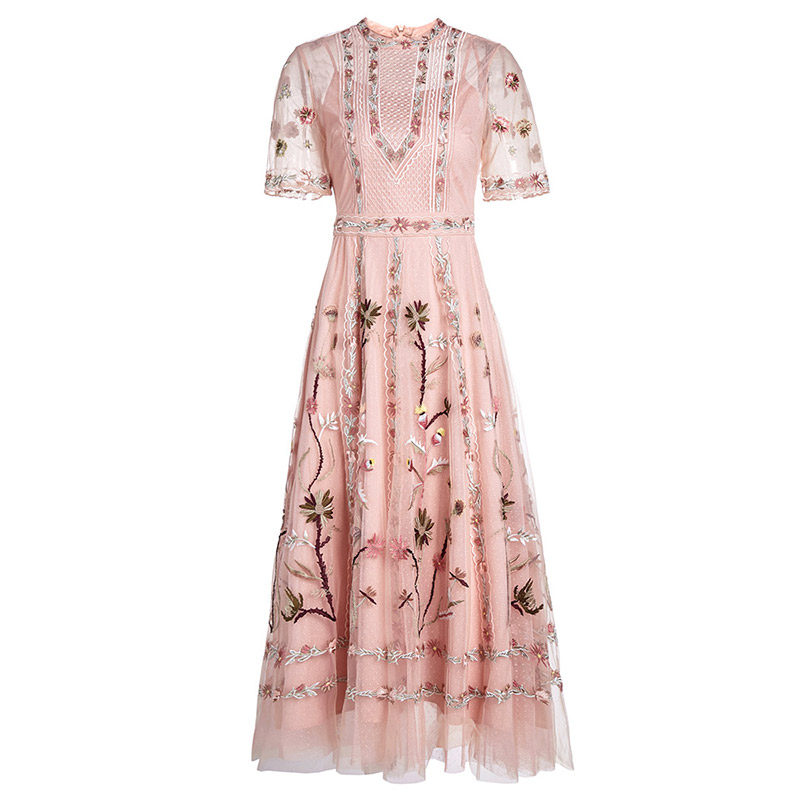 DIDA夏季新款女装网纱重工刺绣收腰显瘦大摆长裙礼服裙名媛连衣裙