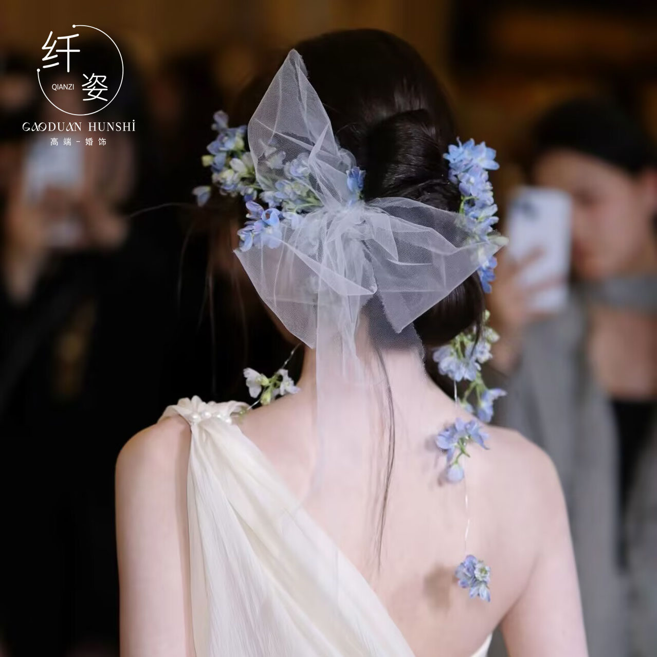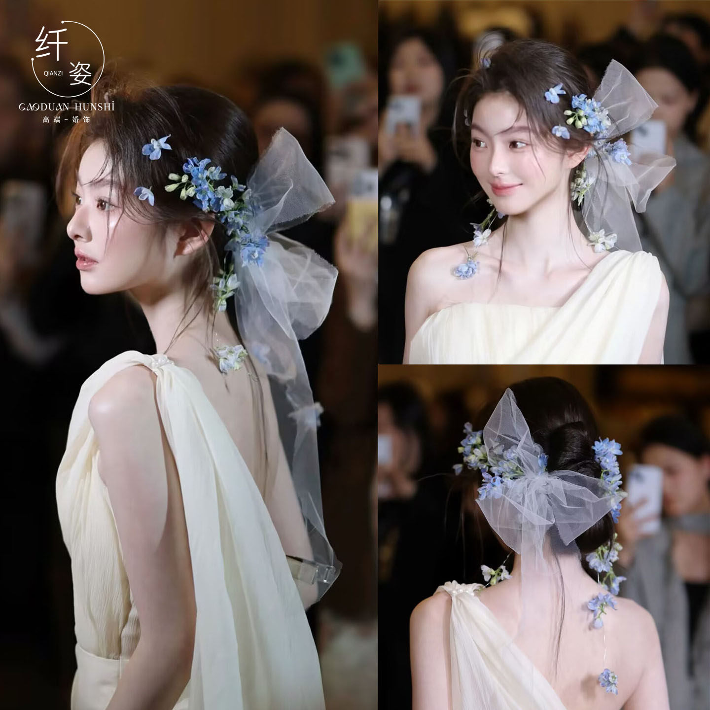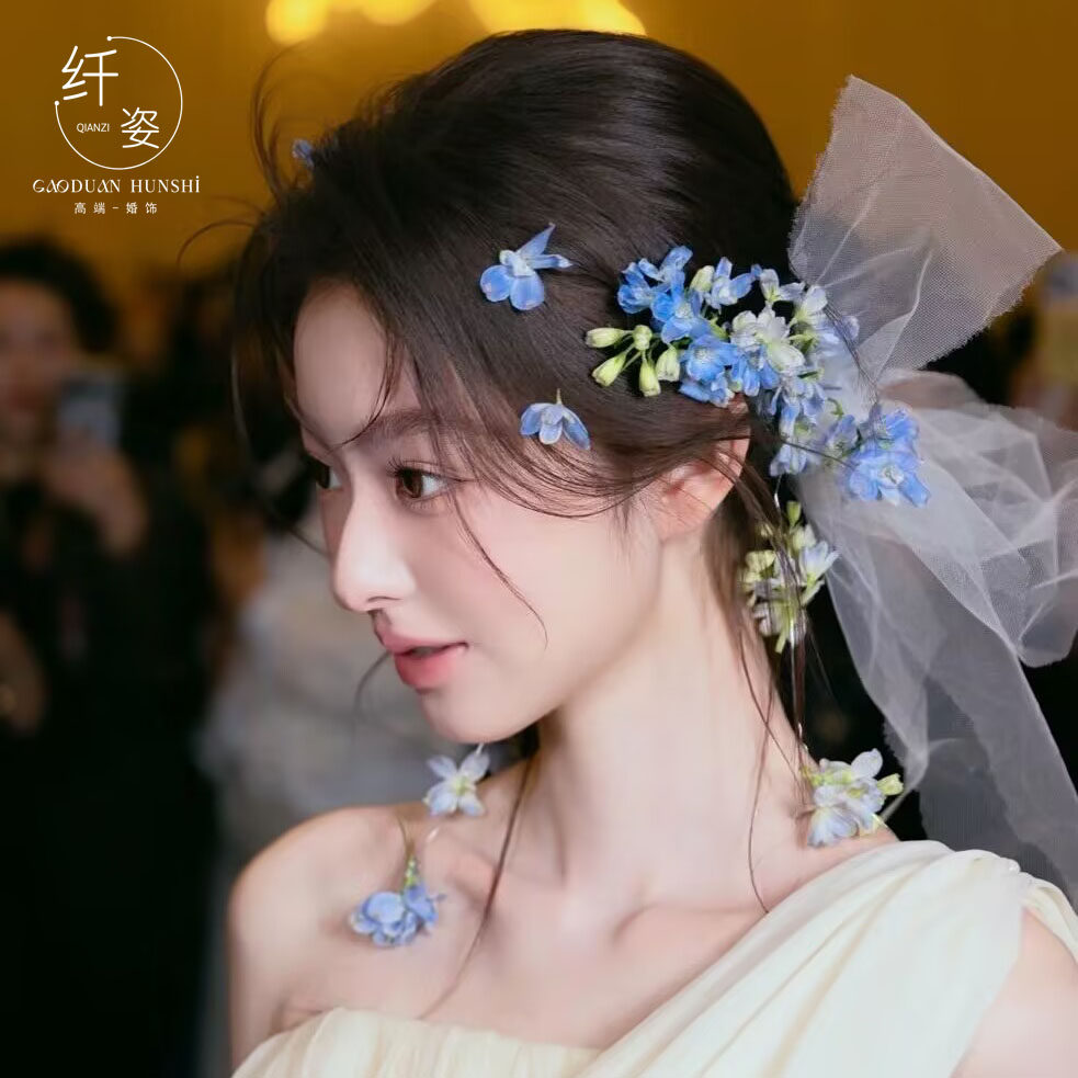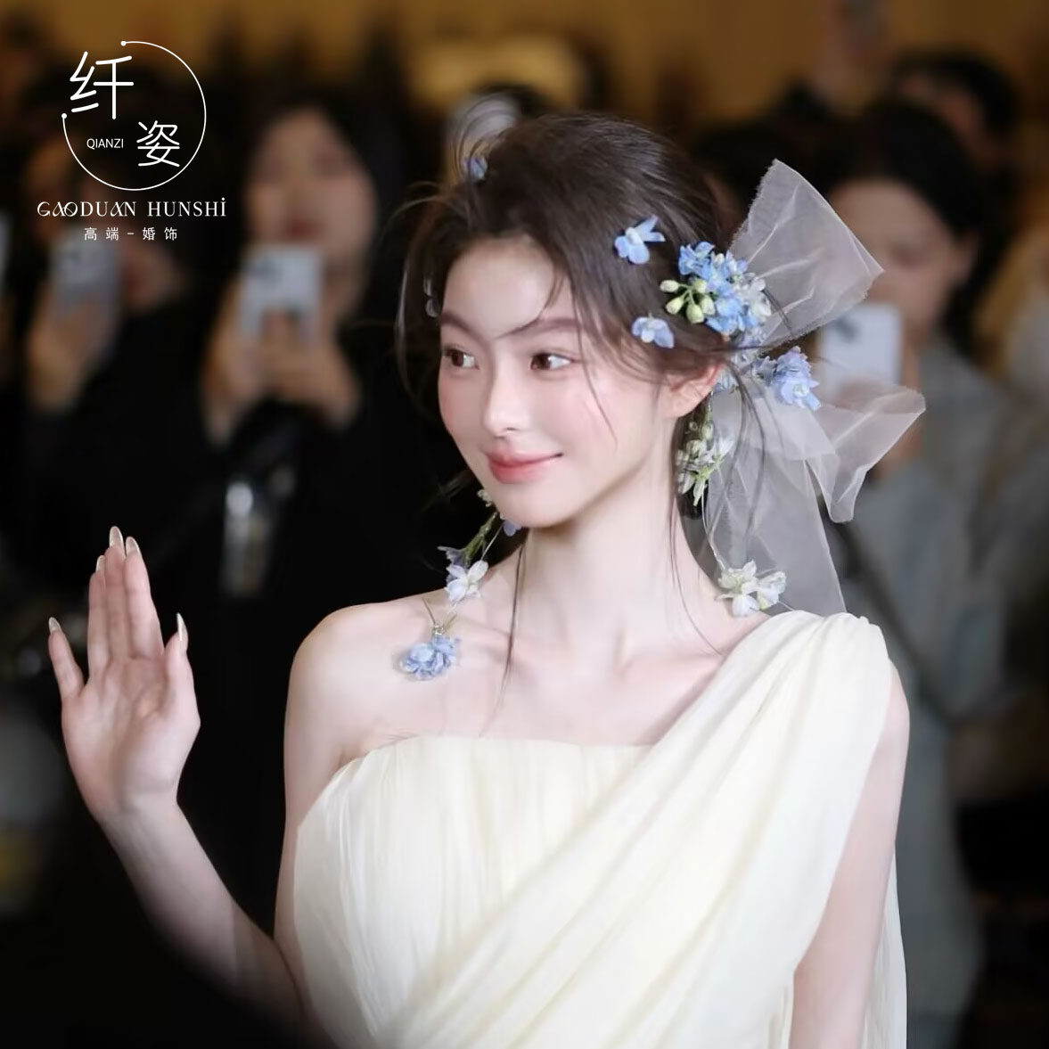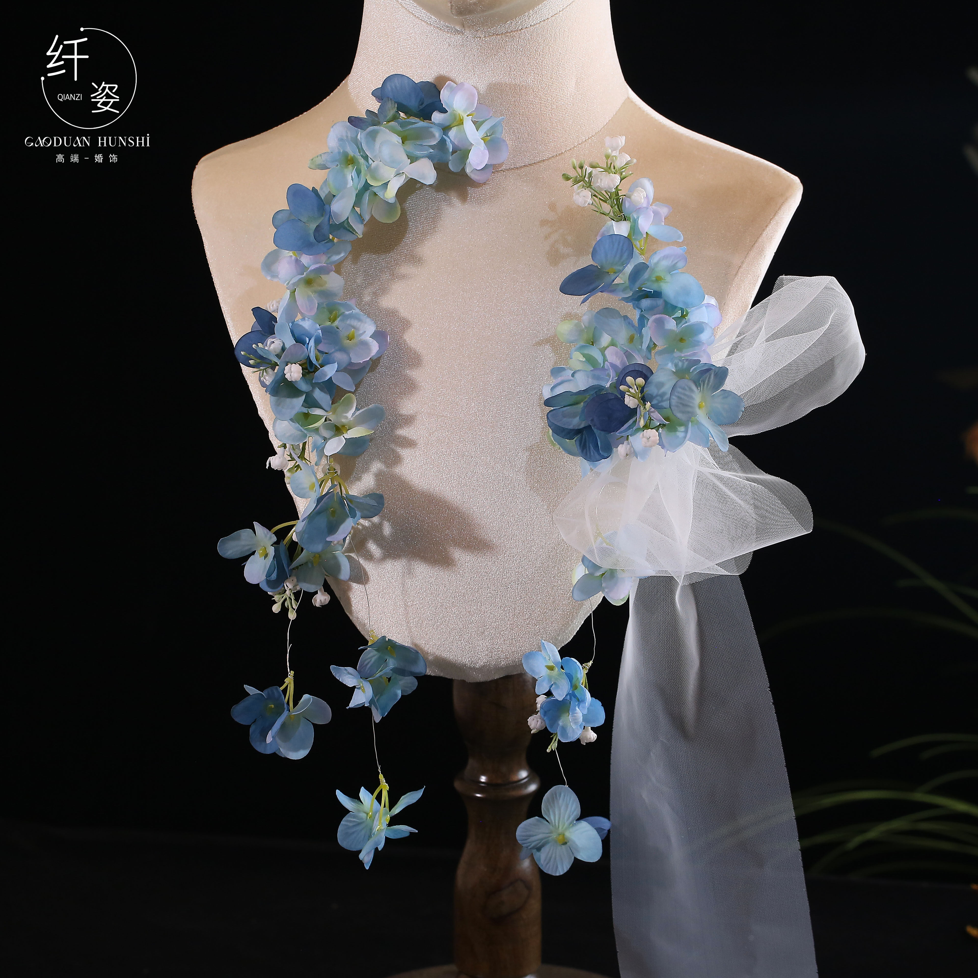 新款小清新蓝色花朵头饰森系花环高级感新娘晨袍鲜花造型旅拍大气